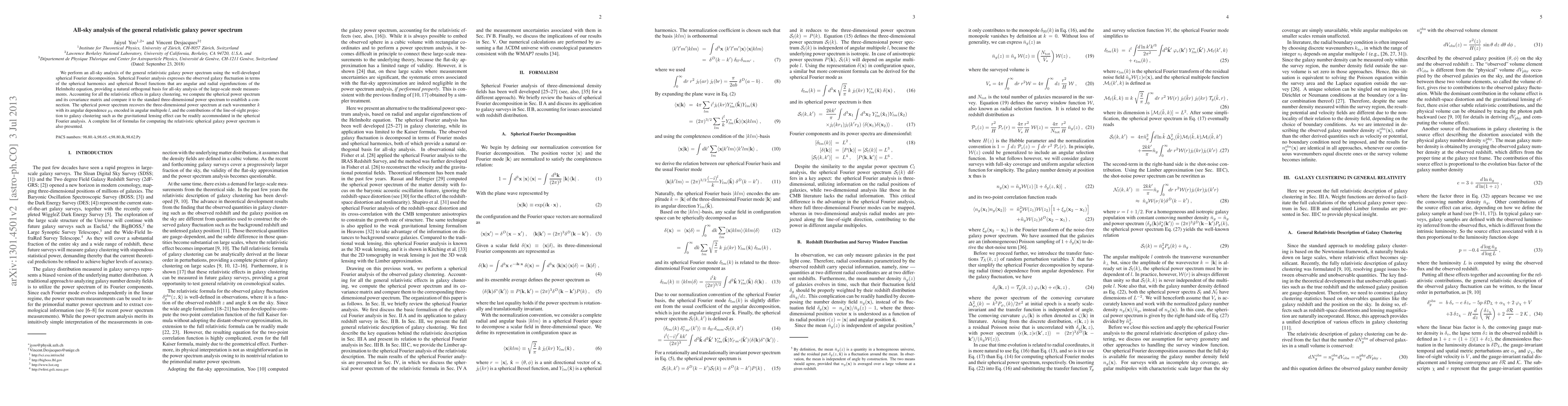 This paper conducts an all-sky analysis of the general relativistic galaxy power spectrum using spherical Fourier decomposition, comparing it to the standard three-dimensional power spectrum and detailing the relativistic effects in galaxy clustering. The spherical power spectrum effectively captures the three-dimensional power spectrum, including gravitational lensing effects.