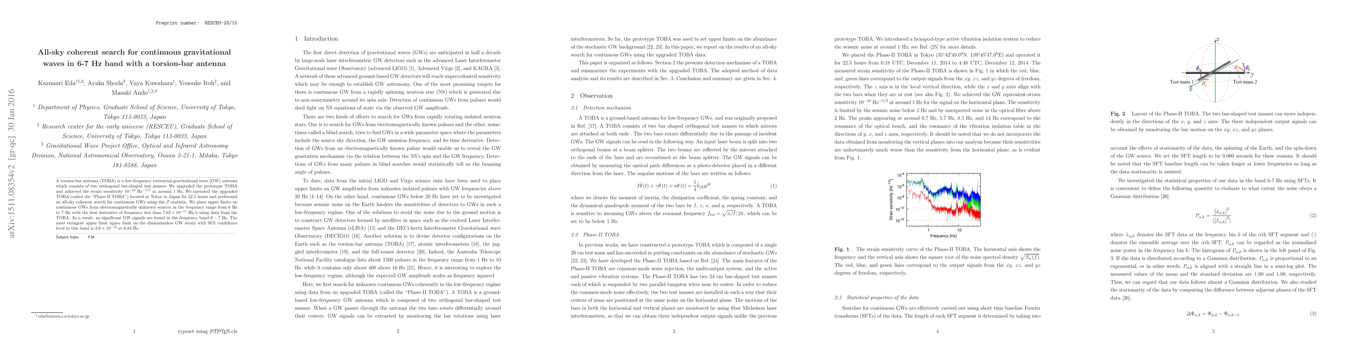 Researchers used a torsion-bar antenna to search for continuous gravitational waves in the 6-7 Hz band, setting an upper limit of $3.6 imes 10^{-12}$ on the dimensionless GW strain with 95% confidence.