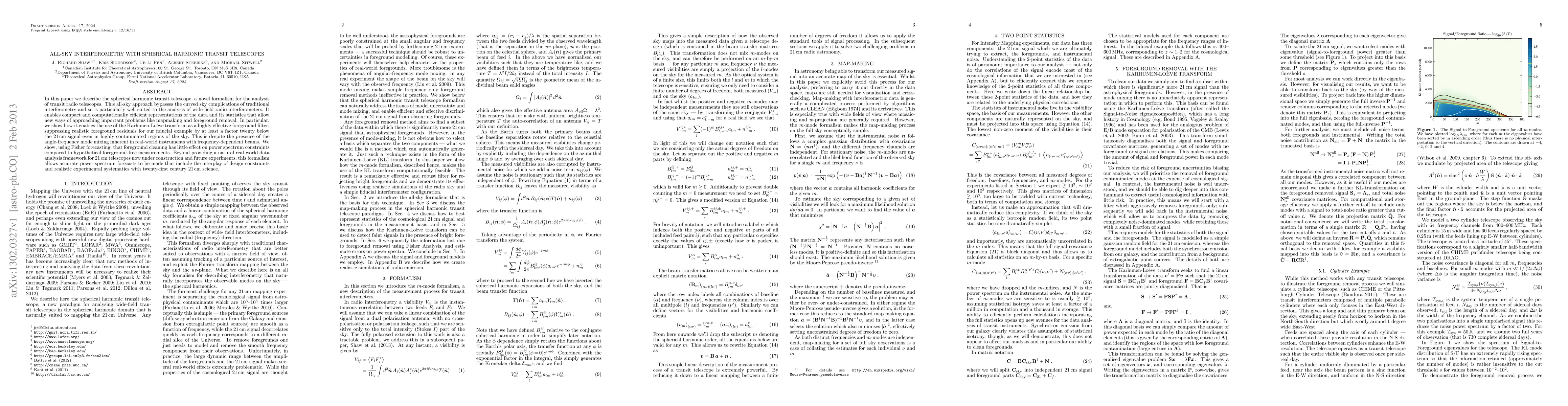 This paper introduces the spherical harmonic transit telescope, an all-sky interferometry method that simplifies data analysis by bypassing traditional interferometry's sky curvature issues. It effectively employs the Karhunen-Loeve transform to significantly reduce foreground noise, enhancing 21cm signal clarity.