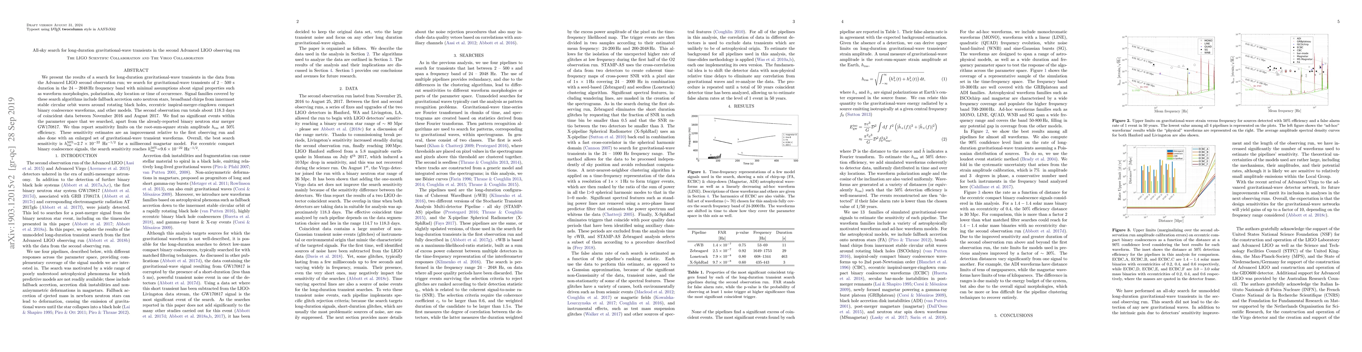 This paper reports on an all-sky search for long-duration gravitational-wave transients during the second Advanced LIGO observing run, finding no significant events beyond the known binary neutron star merger GW170817. The search improved sensitivity limits, achieving a best sensitivity of $h_{\mathrm{rss}}^{50\%}=2.7\times10^{-22}$ Hz$^{-1/2}$ for millisecond magnetar models.