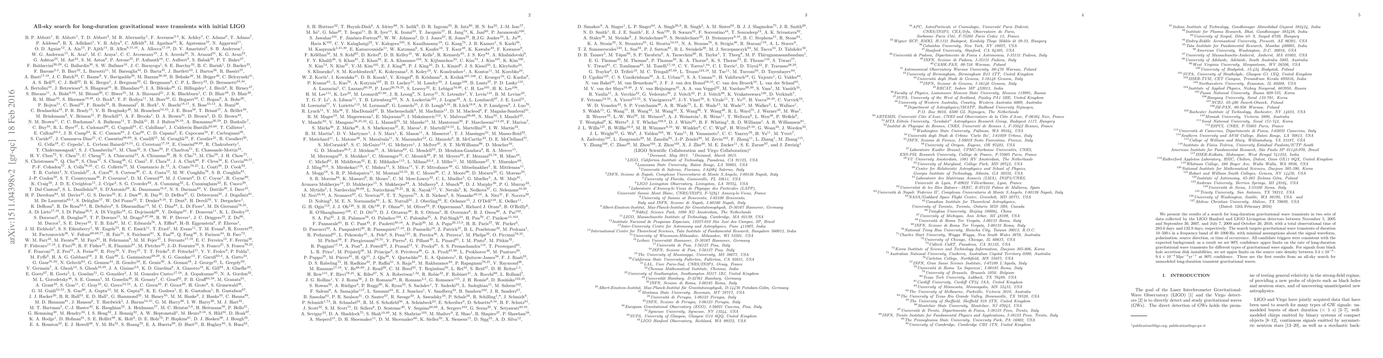 This study reports an all-sky search for long-duration gravitational wave transients using LIGO data from 2005-2007 and 2009-2010, finding no confirmed signals. It sets upper limits on the rate of such transients, particularly for black hole accretion disk instabilities, providing the first results of its kind.