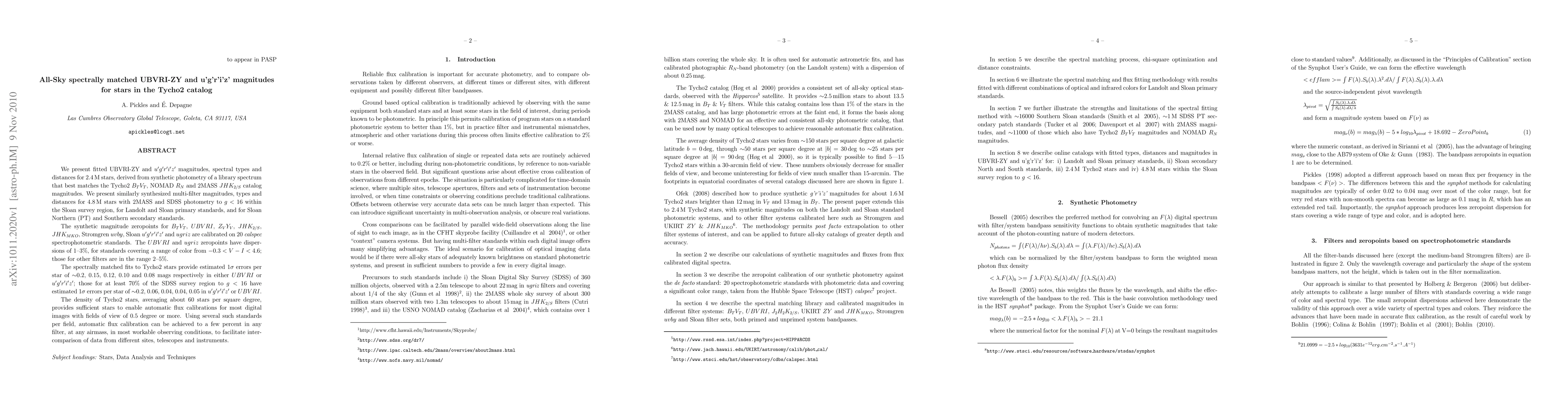 We present fitted UBVRI-ZY and u'g'r'i'z' magnitudes, spectral types and distances for 2.4M stars, derived from synthetic photometry of a library spectrum that best matches the Tycho2 BtVt, NOMAD Rn and 2MASS JHK_{2/S} catalog magnitudes. We present similarly synthesized multi-filter magnitudes, types and distances for 4.8M stars with 2MASS and SDSS photometry to g<16 within the Sloan survey region, for Landolt and Sloan primary standards, and for Sloan Northern (PT) and Southern secondary standards. The synthetic magnitude zeropoints for BtVt, UBVRI, ZvYv, JHK_{2/S}, JHK_{MKO}, Stromgren uvby, Sloan u'g'r'i'z' and ugriz are calibrated on 20 calspec spectrophotometric standards. The UBVRI and ugriz zeropoints have dispersions of 1--3%, for standards covering a range of color from -0.3 < V-I < 4.6; those for other filters are in the range 2--5%. The spectrally matched fits to Tycho2 stars provide estimated 1-sigma errors per star of ~0.2, 0.15, 0.12, 0.10 and 0.08 mags respectively in either UBVRI or u'g'r'i'z'; those for at least 70% of the SDSS survey region to g<16 have estimated 1-sigma errors per star of ~0.2, 0.06, 0.04, 0.04, 0.05 in u'g'r'i'z' or UBVRI. The density of Tycho2 stars, averaging about 60 stars per square degree, provides sufficient stars to enable automatic flux calibrations for most digital images with fields of view of 0.5 degree or more. Using several such standards per field, automatic flux calibration can be achieved to a few percent in any filter, at any airmass, in most workable observing conditions, to facilitate inter-comparison of data from different sites, telescopes and instruments.