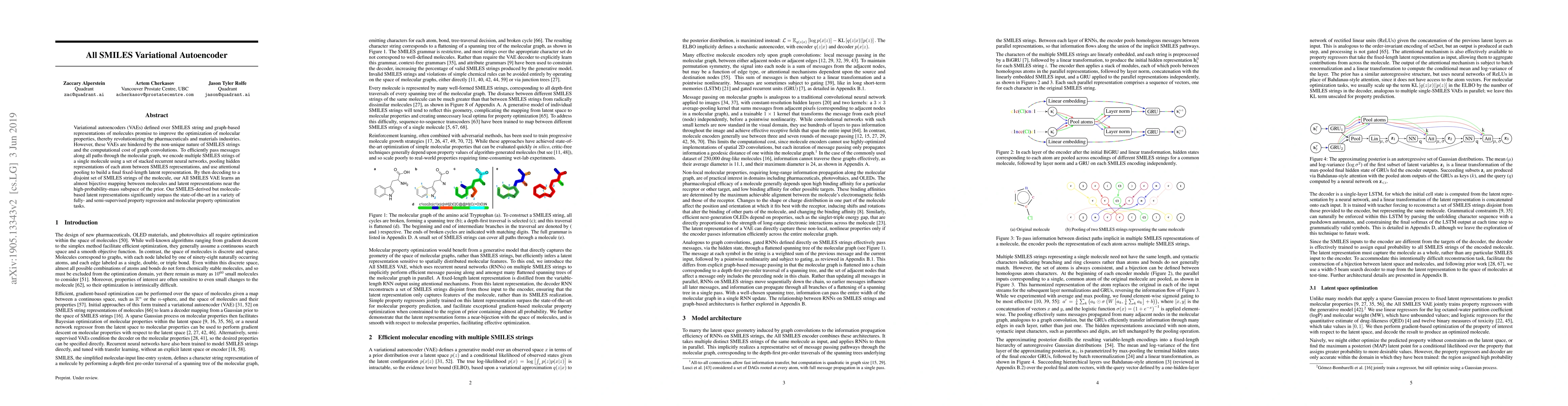 Variational autoencoders (VAEs) defined over SMILES string and graph-based representations of molecules promise to improve the optimization of molecular properties, thereby revolutionizing the pharmaceuticals and materials industries. However, these VAEs are hindered by the non-unique nature of SMILES strings and the computational cost of graph convolutions. To efficiently pass messages along all paths through the molecular graph, we encode multiple SMILES strings of a single molecule using a set of stacked recurrent neural networks, pooling hidden representations of each atom between SMILES representations, and use attentional pooling to build a final fixed-length latent representation. By then decoding to a disjoint set of SMILES strings of the molecule, our All SMILES VAE learns an almost bijective mapping between molecules and latent representations near the high-probability-mass subspace of the prior. Our SMILES-derived but molecule-based latent representations significantly surpass the state-of-the-art in a variety of fully- and semi-supervised property regression and molecular property optimization tasks.