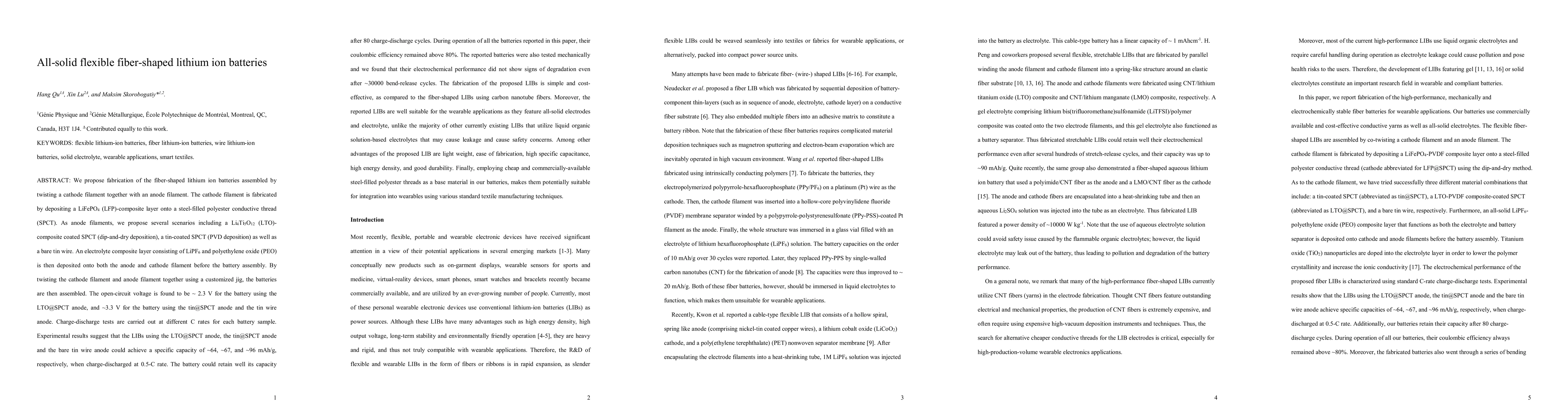 We propose fabrication of the fiber-shaped lithium ion batteries assembled by twisting a cathode filament together with an anode filament. The cathode filament is fabricated by depositing a LiFePO4 (LFP)-composite layer onto a steel-filled polyester conductive thread (SPCT). As anode filaments, we propose several scenarios including a Li4Ti5O12 (LTO)-composite coated SPCT (dip-and-dry deposition), a tin-coated SPCT (PVD deposition) as well as a bare tin wire. An electrolyte composite layer consisting of LiPF6 and polyethylene oxide (PEO) is then deposited onto both the anode and cathode filament before the battery assembly. By twisting the cathode filament and anode filament together using a customized jig, the batteries are then assembled. The open-circuit voltage is found to be ~ 2.3 V for the battery using the LTO@SPCT anode, and ~3.3 V for the battery using the tin@SPCT anode and the tin wire anode. Charge-discharge tests are carried out at different C rates for each battery sample. Experimental results suggest that the LIBs using the LTO@SPCT anode, the tin@SPCT anode and the bare tin wire anode could achieve a specific capacity of ~64, ~67, and ~96 mAh/g, respectively, when charge-discharged at 0.5-C rate. The battery could retain well its capacity after 80 charge-discharge cycles. During operation of all the batteries reported in this paper, their coulombic efficiency remained above 80%. Among the advantages of the proposed LIB are light weight, ease of fabrication, high specific capacitance, high energy density, and good durability. Finally, employing cheap and commercially-available steel-filled polyester threads as a base material in our batteries, makes them potentially suitable for integration into wearables using various standard textile manufacturing techniques.