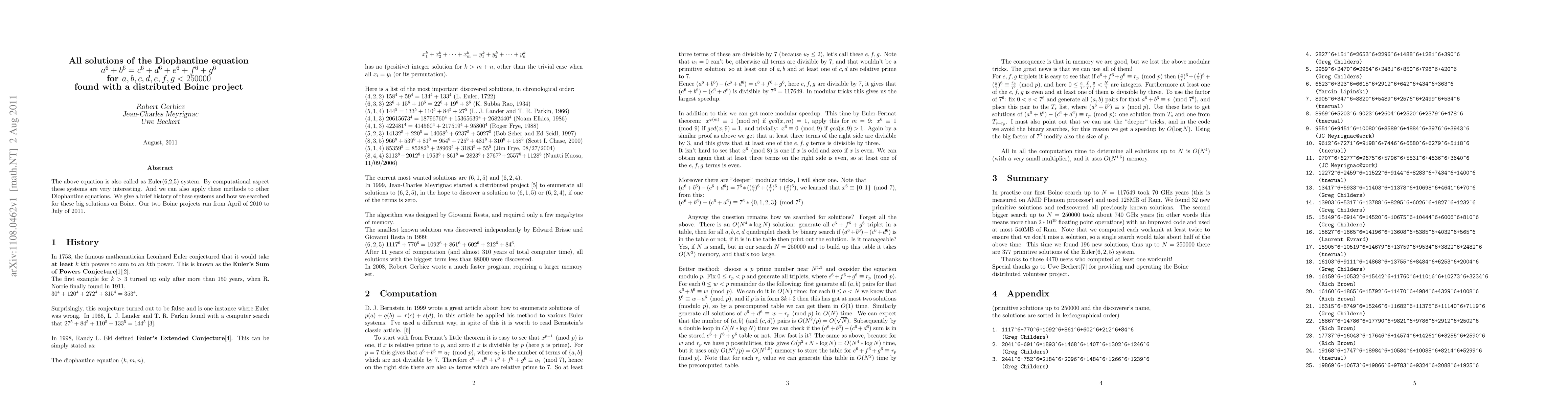The above equation is also called as Euler(6,2,5) system. By computational aspect these systems are very interesting. And we can also apply these methods to other Diophantine equations. We give a brief history of these systems and how we searched for these big solutions on Boinc. Our two Boinc projects ran from April of 2010 to July of 2011.