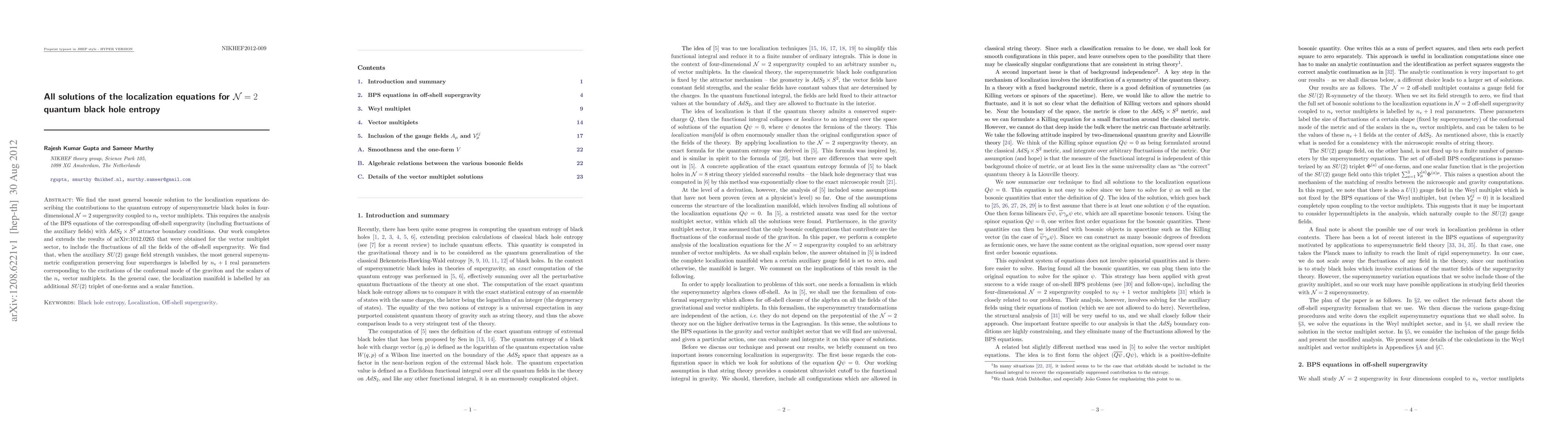 We find the most general bosonic solution to the localization equations describing the contributions to the quantum entropy of supersymmetric black holes in four-dimensional N=2 supergravity coupled to n_v vector multiplets. This requires the analysis of the BPS equations of the corresponding off-shell supergravity (including fluctuations of the auxiliary fields) with AdS2 \times S2 attractor boundary conditions. Our work completes and extends the results of arXiv:1012.0265 that were obtained for the vector multiplet sector, to include the fluctuations of all the fields of the off-shell supergravity. We find that, when the auxiliary SU(2) gauge field strength vanishes, the most general supersymmetric configuration preserving four supercharges is labelled by n_v+1 real parameters corresponding to the excitations of the conformal mode of the graviton and the scalars of the n_v vector multiplets. In the general case, the localization manifold is labelled by an additional SU(2) triplet of one-forms and a scalar function.
