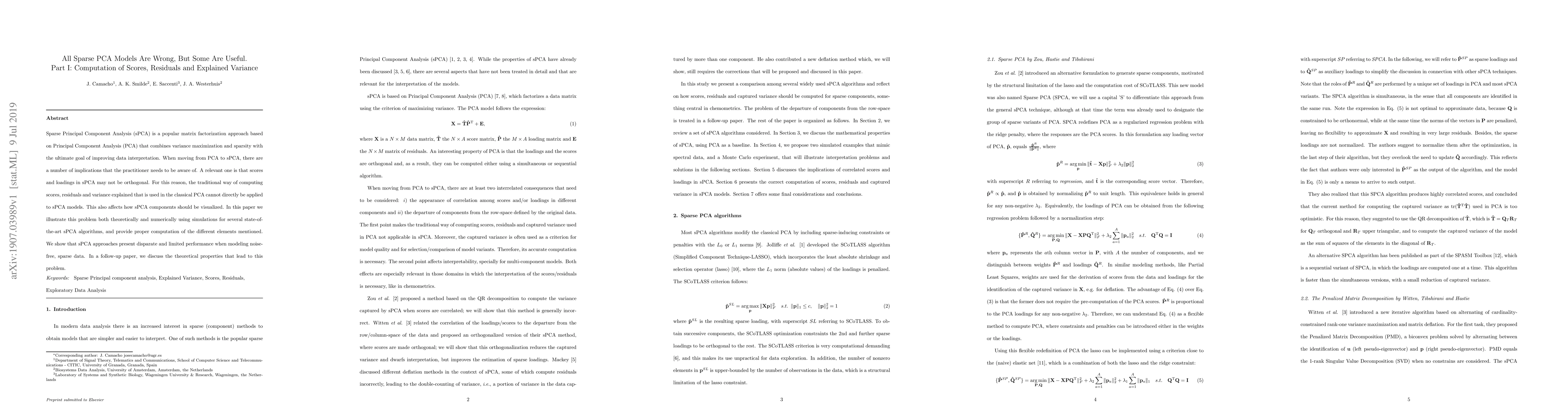 Sparse Principal Component Analysis (sPCA) is a popular matrix factorization approach based on Principal Component Analysis (PCA) that combines variance maximization and sparsity with the ultimate goal of improving data interpretation. When moving from PCA to sPCA, there are a number of implications that the practitioner needs to be aware of. A relevant one is that scores and loadings in sPCA may not be orthogonal. For this reason, the traditional way of computing scores, residuals and variance explained that is used in the classical PCA cannot directly be applied to sPCA models. This also affects how sPCA components should be visualized. In this paper we illustrate this problem both theoretically and numerically using simulations for several state-of-the-art sPCA algorithms, and provide proper computation of the different elements mentioned. We show that sPCA approaches present disparate and limited performance when modeling noise-free, sparse data. In a follow-up paper, we discuss the theoretical properties that lead to this problem.