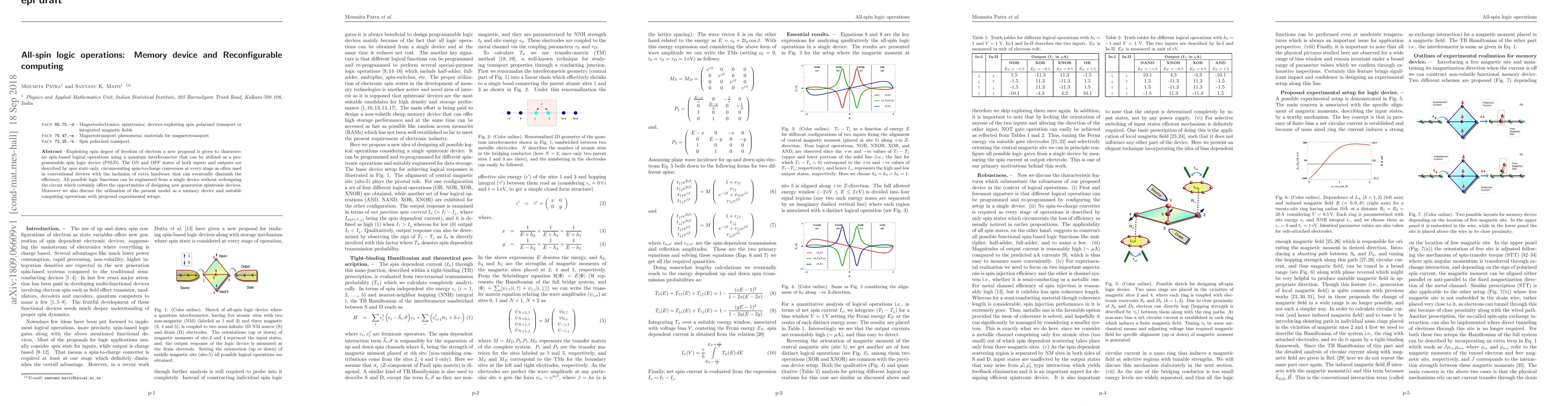 This paper proposes a novel spin-based logic device using quantum interferometry, enabling all-spin logic operations without spin-to-charge conversion, thus enhancing efficiency. The device can perform all logic functions and is also applicable for memory storage and reconfigurable computing.