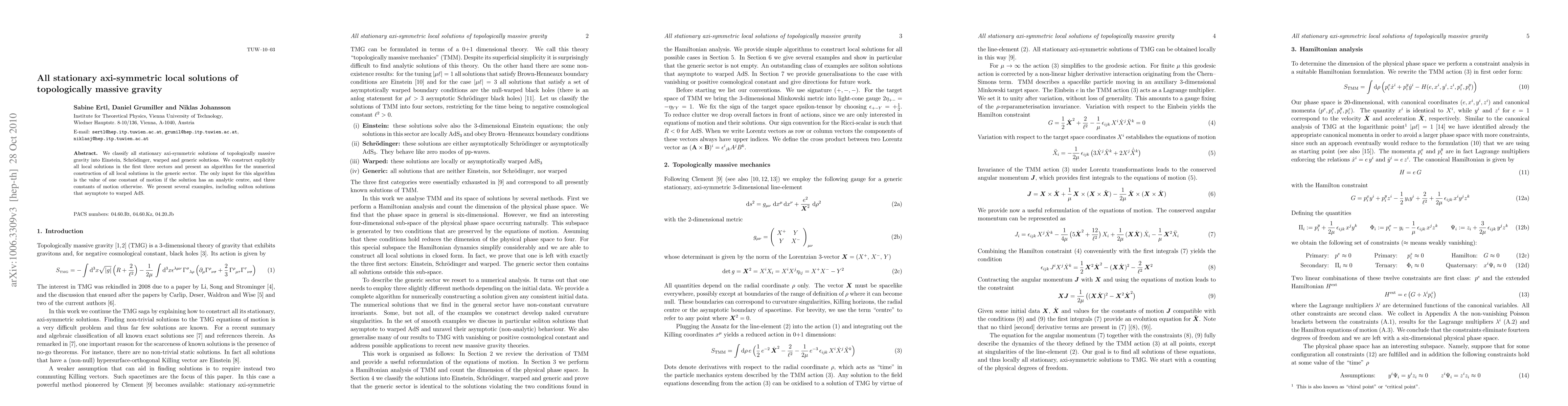 We classify all stationary axi-symmetric solutions of topologically massive gravity into Einstein, Schr\"odinger, warped and generic solutions. We construct explicitly all local solutions in the first three sectors and present an algorithm for the numerical construction of all local solutions in the generic sector. The only input for this algorithm is the value of one constant of motion if the solution has an analytic centre, and three constants of motion otherwise. We present several examples, including soliton solutions that asymptote to warped AdS.