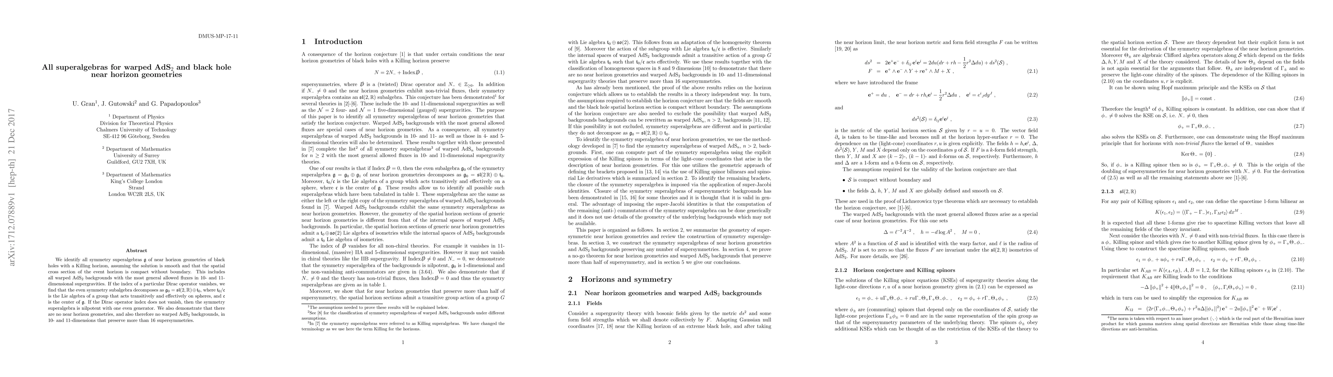 This paper identifies all symmetry superalgebras of black hole near-horizon geometries with a Killing horizon, focusing on warped AdS$_2$ backgrounds in 10- and 11-dimensional supergravities. When the Dirac operator's index vanishes, the symmetry algebra decomposes into $\mathfrak{sl}(2,\mathbb{R})\oplus\mathfrak{t}_0$. The paper concludes that no such geometries preserve more than 16 supersymmetries.