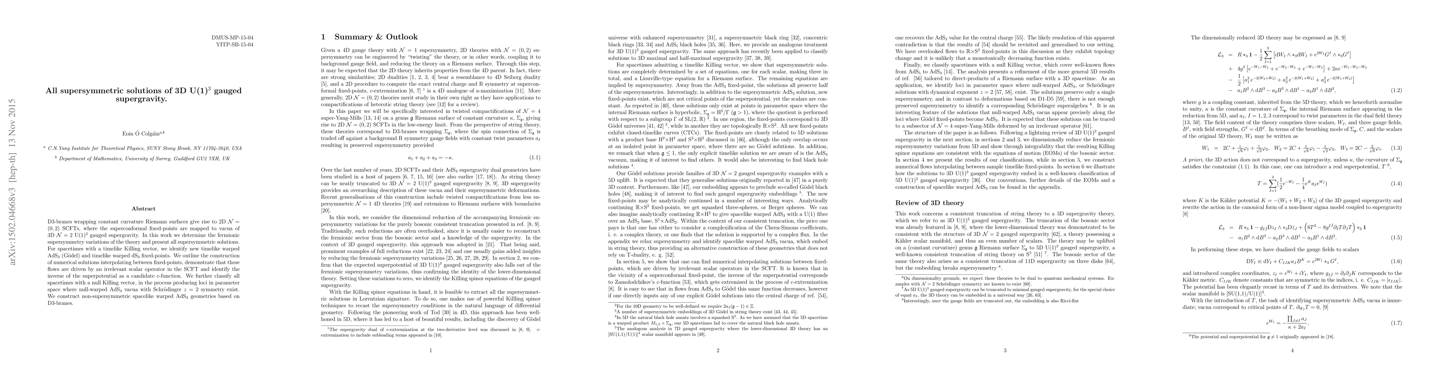 D3-branes wrapping constant curvature Riemann surfaces give rise to 2D N = (0,2) SCFTs, where the superconformal fixed-points are mapped to vacua of 3D N =2 U(1)^3 gauged supergravity. In this work we determine the fermionic supersymmetry variations of the theory and present all supersymmetric solutions. For spacetimes with a timelike Killing vector, we identify new timelike warped AdS_3 (G\"odel) and timelike warped dS_3 critical points. We outline the construction of numerical solutions interpolating between fixed-points, demonstrate that these flows are driven by an irrelevant scalar operator in the SCFT and identify the inverse of the superpotential as a candidate c-function. We further classify all spacetimes with a null Killing vector, in the process producing loci in parameter space where null-warped AdS_3 vacua with Schrodinger z=2 symmetry exist. We construct non-supersymmetric spacelike warped AdS_3 geometries based on D3-branes.