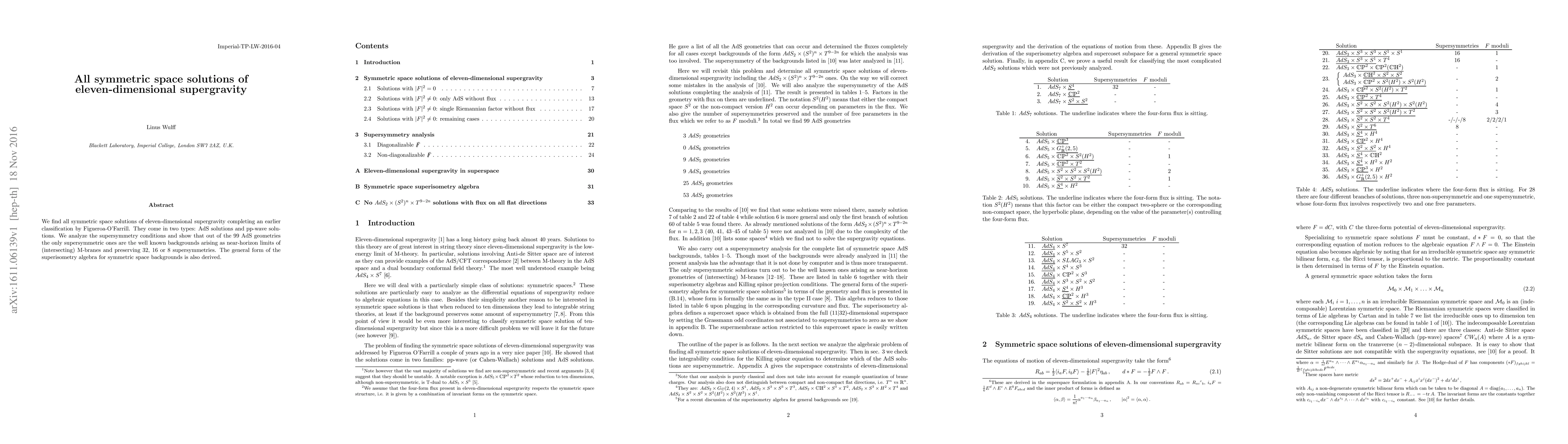 Summary: This paper completes the classification of symmetric space solutions in eleven-dimensional supergravity, identifying two types: AdS and pp-wave solutions. It reveals that only specific AdS geometries with 32, 16, or 8 preserved supersymmetries are supersymmetric, and derives the superisometry algebra for these backgrounds.