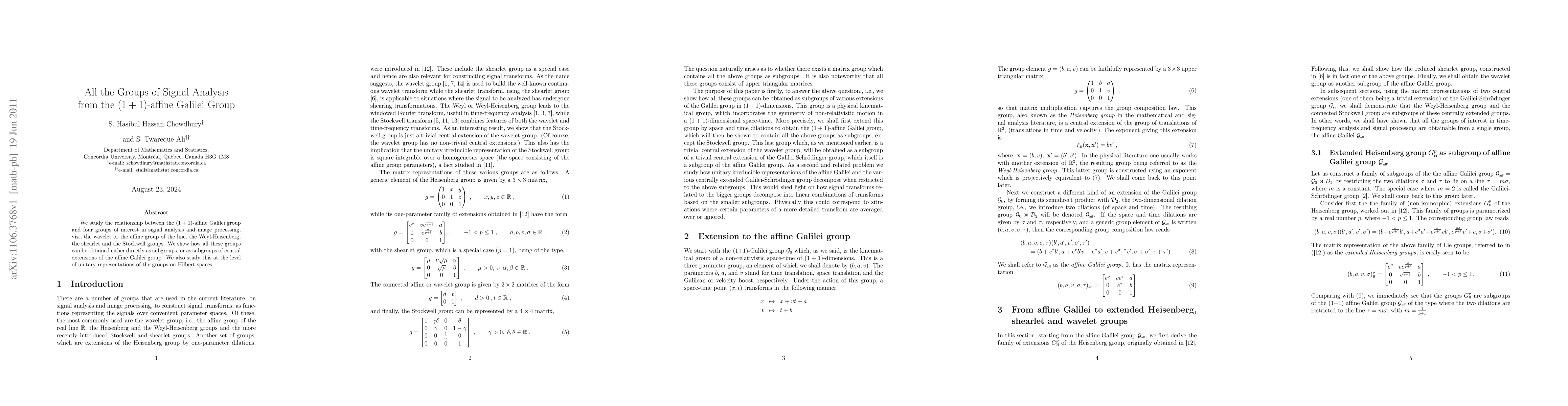 This paper explores the connections between the (1+1)-affine Galilei group and four signal analysis groups: wavelet, Weyl-Heisenberg, shearlet, and Stockwell. It demonstrates how these groups can be derived from the Galilei group or its central extensions, and examines their unitary representations on Hilbert spaces.