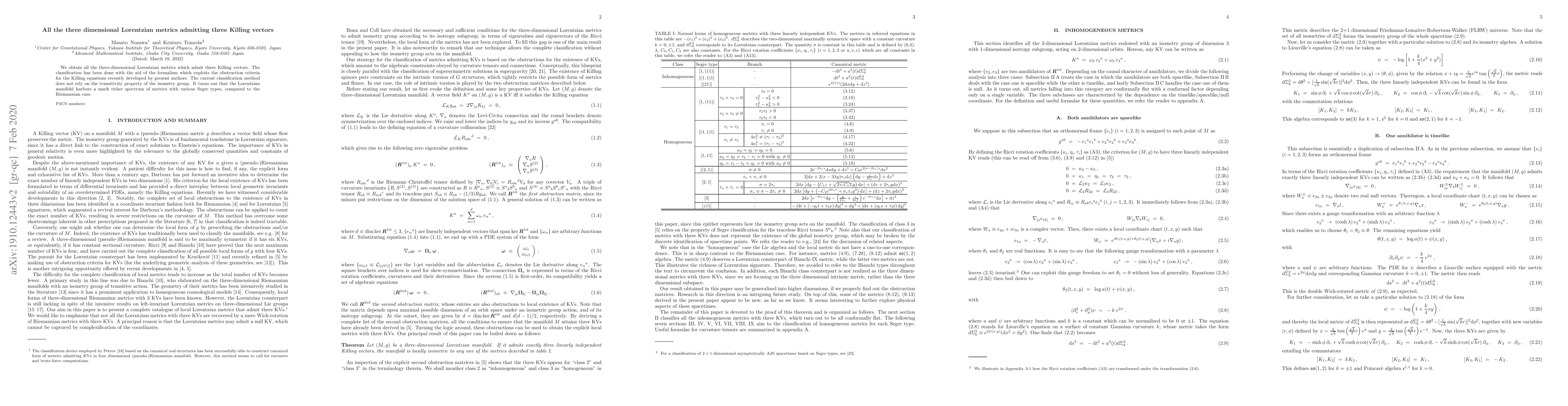 This paper classifies all three-dimensional Lorentzian metrics that admit three Killing vectors using a novel formalism that does not depend on the transitivity of the isometry group, revealing a diverse range of Segre types not seen in the Riemannian case.
