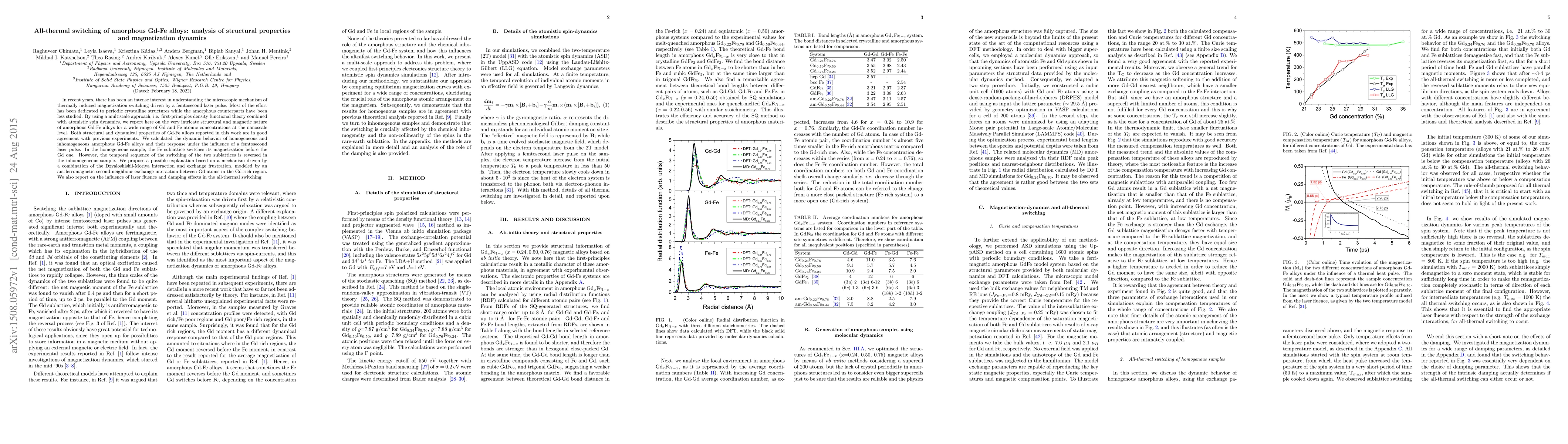 This paper investigates the structural and magnetization dynamics of amorphous Gd-Fe alloys using a multiscale approach, revealing distinct switching behaviors in homogeneous and inhomogeneous samples under femtosecond laser pulses. The study proposes a mechanism involving the Dzyaloshiskii-Moriya interaction and exchange frustration to explain the observed differences.