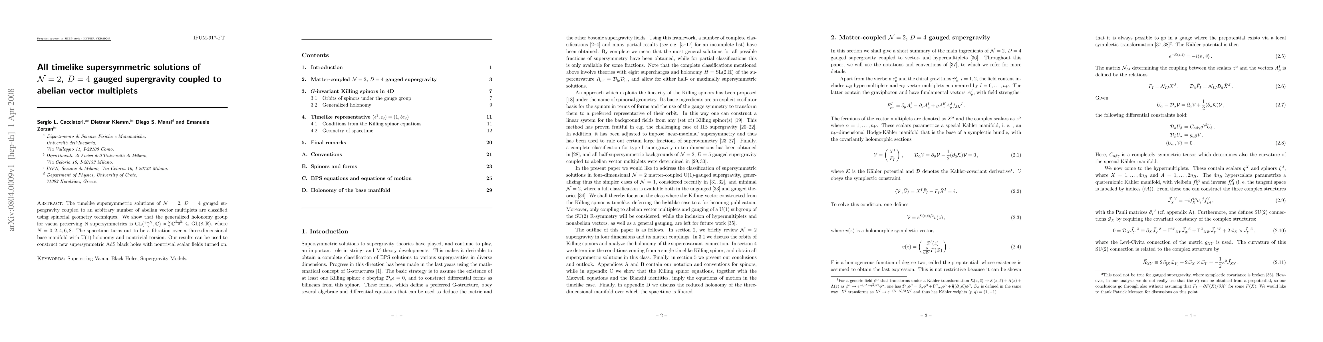 Researchers classified timelike supersymmetric solutions of N=2, D=4 gauged supergravity coupled to abelian vector multiplets, finding a connection between the spacetime's geometry and its ability to host supersymmetric AdS black holes.