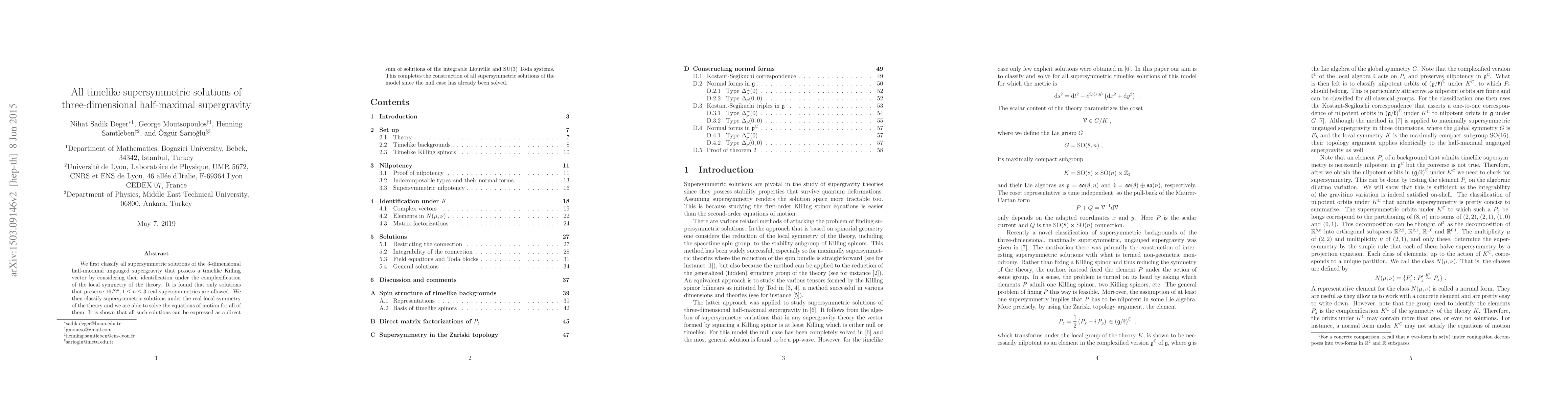 This paper classifies all timelike supersymmetric solutions of 3D half-maximal supergravity, finding that only those preserving up to 16/8 real supersymmetries are allowed. It solves the equations of motion for these solutions, showing they can be expressed as a direct sum of Liouville and SU(3) Toda systems.