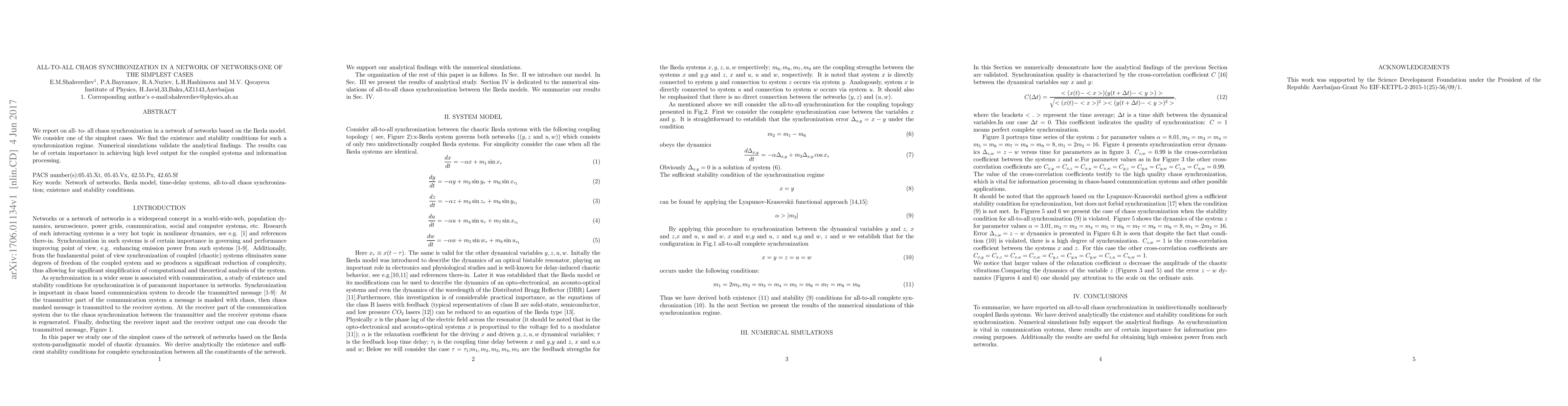 We report on all- to- all chaos synchronization in a network of networks based on the Ikeda model. We consider one of the simplest cases. We find the existence and stability conditions for such a synchronization regime. Numerical simulations validate the analytical findings. The results can be of certain importance in achieving high level output for the coupled systems and information processing.