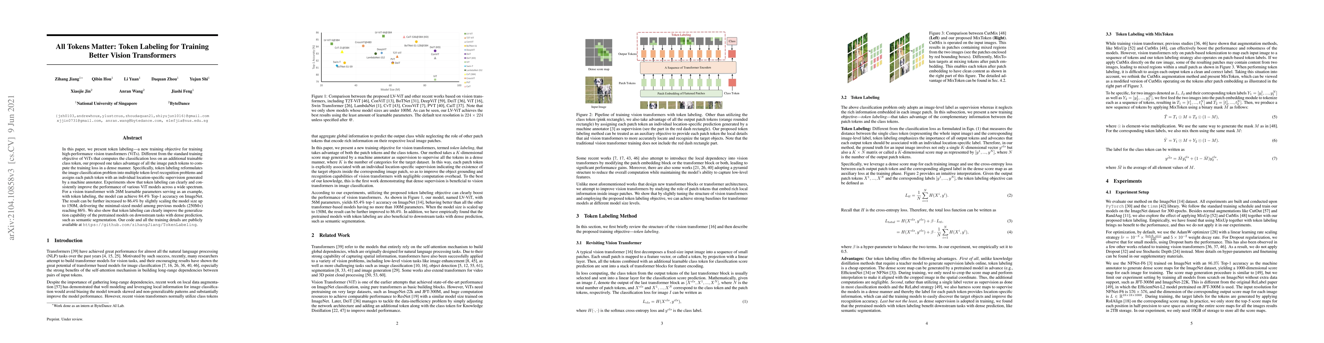 This paper introduces token labeling, a novel training objective for vision transformers (ViTs) that leverages all image patch tokens for dense training, improving performance over traditional methods. Experiments demonstrate significant gains in accuracy on ImageNet and enhanced generalization for tasks like semantic segmentation.