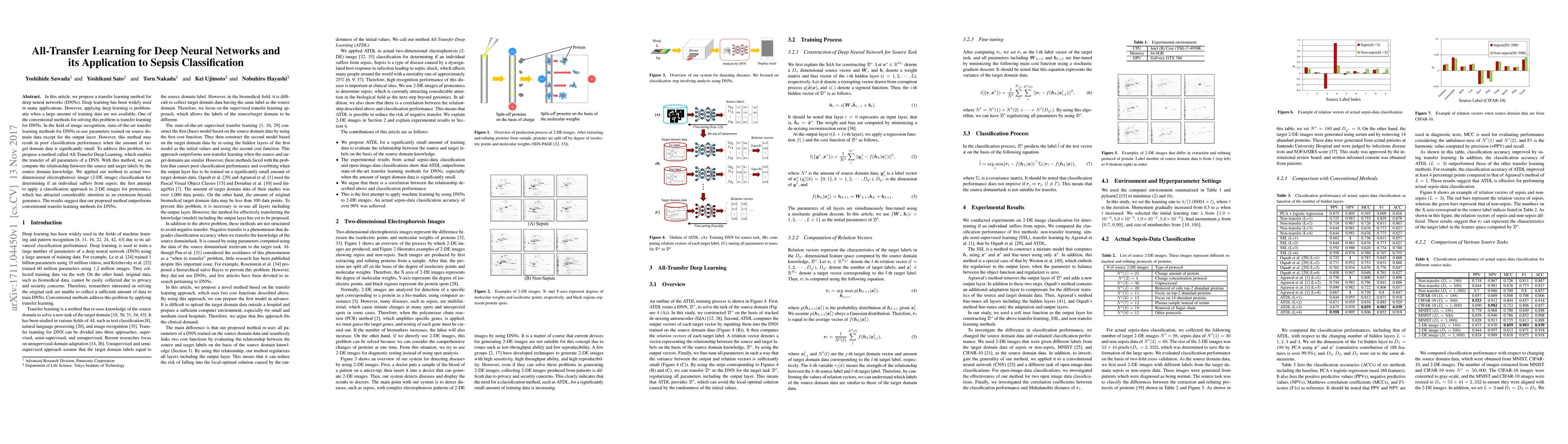 This paper proposes All-Transfer Deep Learning, a method that transfers all parameters of a deep neural network to improve classification performance when target domain data is limited. The method was applied to sepsis classification using 2-DE images, outperforming conventional transfer learning techniques.