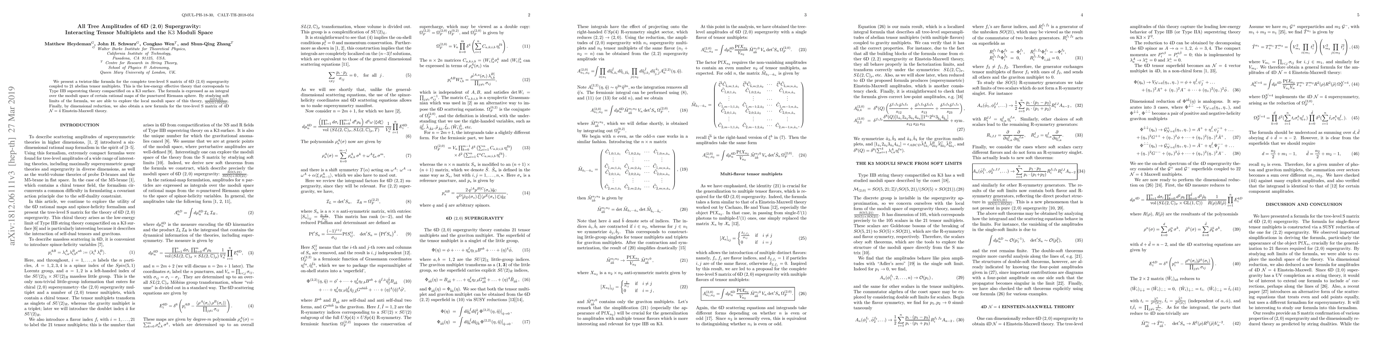 We present a twistor-like formula for the complete tree-level S matrix of 6D $(2,0)$ supergravity coupled to $21$ abelian tensor multiplets. This is the low-energy effective theory that corresponds to Type IIB superstring theory compactified on a $\mathrm{K}3$ surface. The formula is expressed as an integral over the moduli space of certain rational maps of the punctured Riemann sphere. By studying soft limits of the formula, we are able to explore the local moduli space of this theory, ${SO(5,21)\over SO(5)\times SO(21)}$. Finally, by dimensional reduction, we also obtain a new formula for the tree-level S matrix of 4D $\mathcal{N}=4$ Einstein-Maxwell theory.
