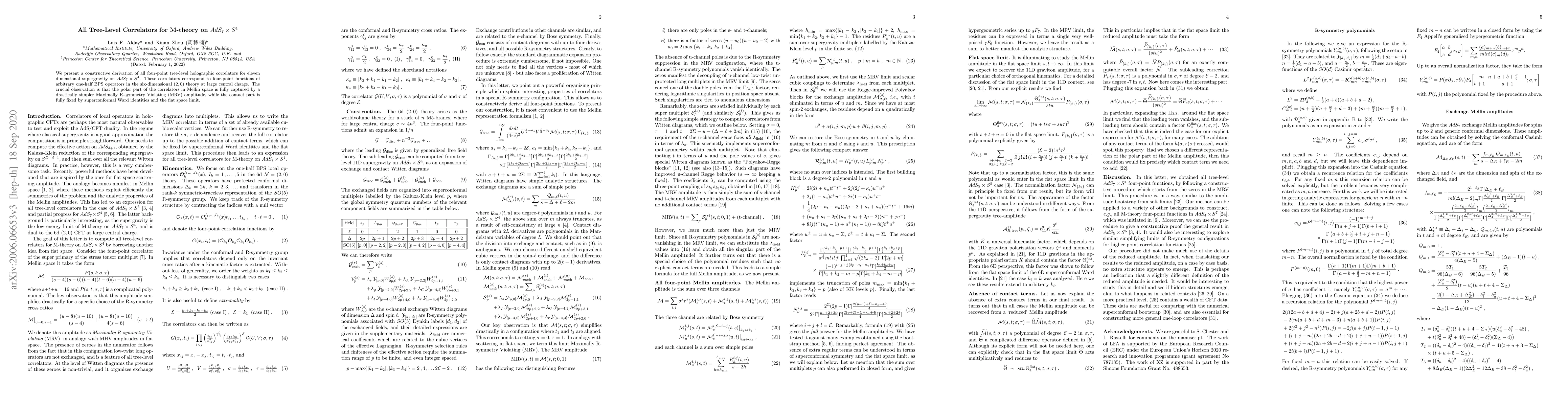 This paper derives all four-point tree-level holographic correlators for M-theory on $AdS_7 \times S^4$, showing that the polar part of these correlators in Mellin space is determined by a simpler Maximally R-symmetry Violating amplitude, while the contact part is fixed by superconformal Ward identities and the flat space limit.