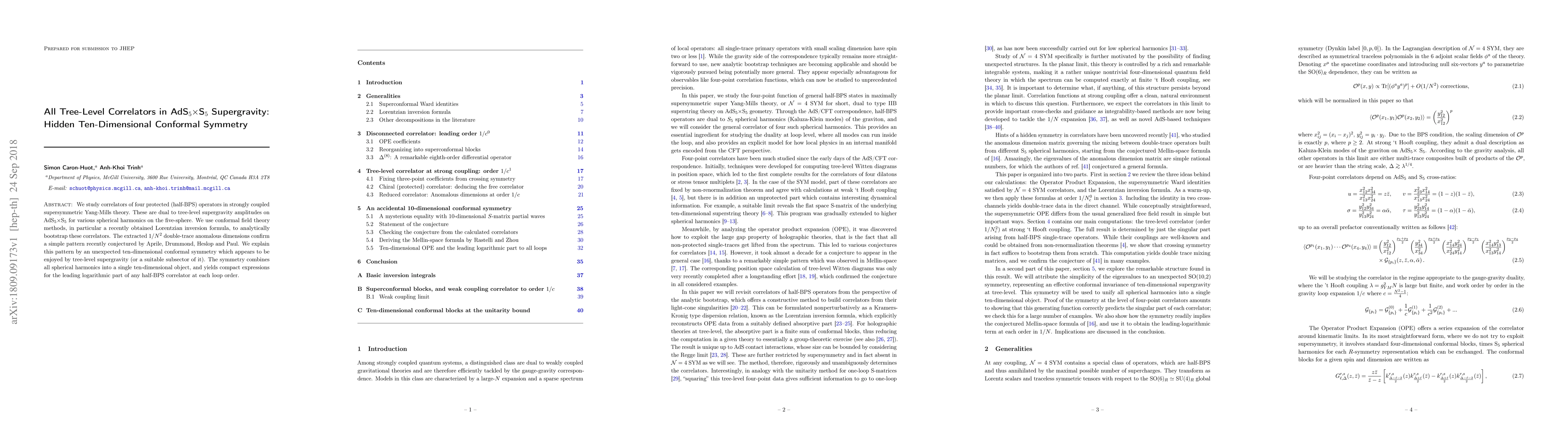 We study correlators of four protected (half-BPS) operators in strongly coupled supersymmetric Yang-Mills theory. These are dual to tree-level supergravity amplitudes on AdS${}_5\times$S${}_5$ for various spherical harmonics on the five-sphere. We use conformal field theory methods, in particular a recently obtained Lorentzian inversion formula, to analytically bootstrap these correlators. The extracted $1/N^2$ double-trace anomalous dimensions confirm a simple pattern recently conjectured by Aprile, Drummond, Heslop and Paul. We explain this pattern by an unexpected ten-dimensional conformal symmetry which appears to be enjoyed by tree-level supergravity (or a suitable subsector of it). The symmetry combines all spherical harmonics into a single ten-dimensional object, and yields compact expressions for the leading logarithmic part of any half-BPS correlator at each loop order.