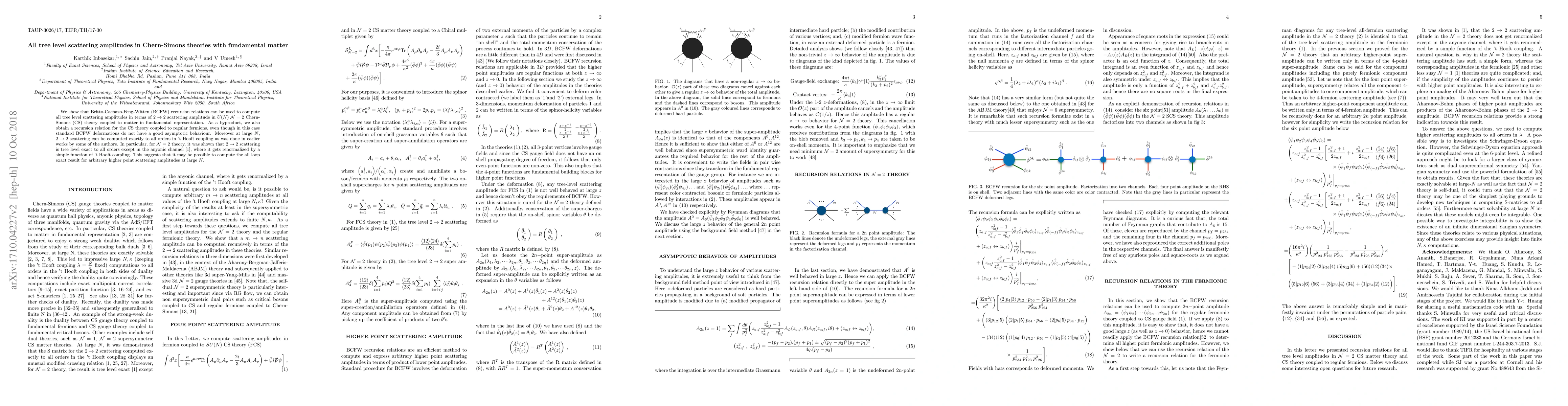 We show that Britto-Cachazo-Feng-Witten (BCFW) recursion relations can be used to compute all tree level scattering amplitudes in terms of $2\rightarrow2$ scattering amplitude in $U(N)$ ${\mathcal N}=2$ Chern-Simons (CS) theory coupled to matter in fundamental representation. As a byproduct, we also obtain a recursion relation for the CS theory coupled to regular fermions, even though in this case standard BCFW deformations do not have a good asymptotic behaviour. Moreover at large $N$, $2\rightarrow 2$ scattering can be computed exactly to all orders in 't Hooft coupling as was done in earlier works by some of the authors. In particular, for ${\mathcal N}=2$ theory, it was shown that $2\rightarrow 2$ scattering is tree level exact to all orders except in the anyonic channel arXiv:1505.06571, where it gets renormalized by a simple function of 't Hooft coupling. This suggests that it may be possible to compute the all loop exact result for arbitrary higher point scattering amplitudes at large $N$.
