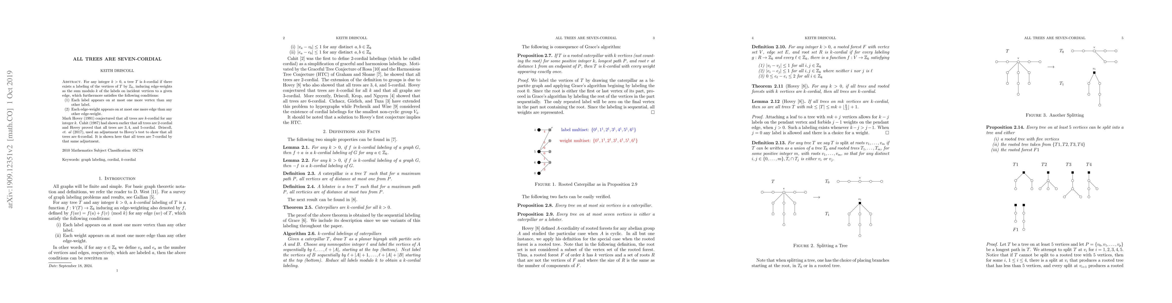This paper proves that all trees are $7$-cordial, confirming a conjecture by Mark Hovey that all trees satisfy the $k$-cordial property for any integer $k>0$. This builds on previous results showing trees are $2$- to $6$-cordial.