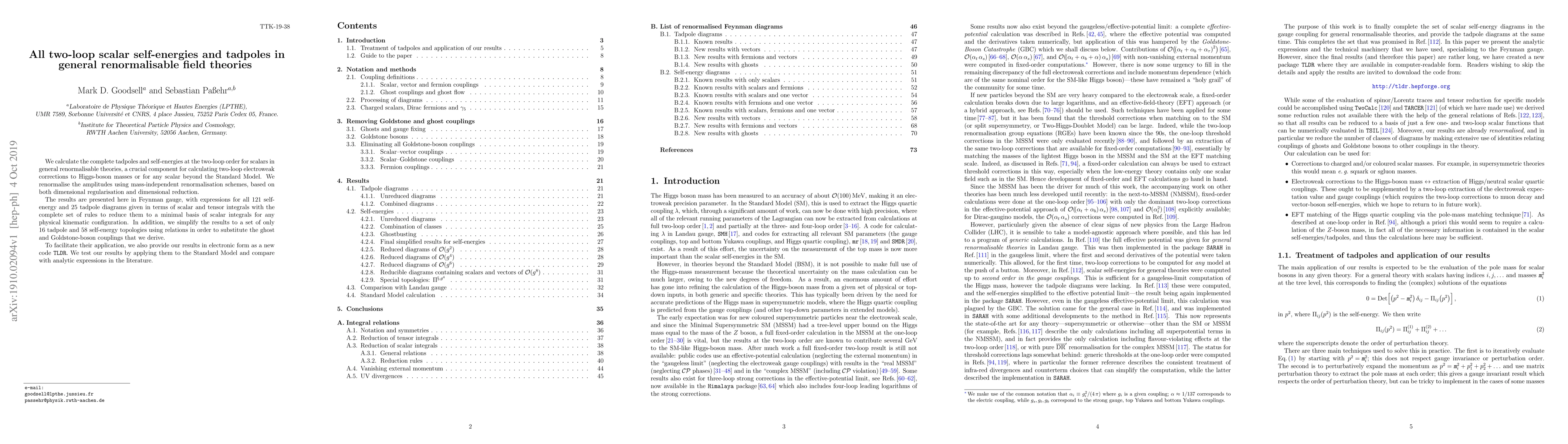 This paper presents the complete two-loop scalar self-energies and tadpoles for general renormalisable field theories, crucial for electroweak corrections to Higgs-boson masses. The results are renormalised using mass-independent schemes and provided in electronic form for easy application.