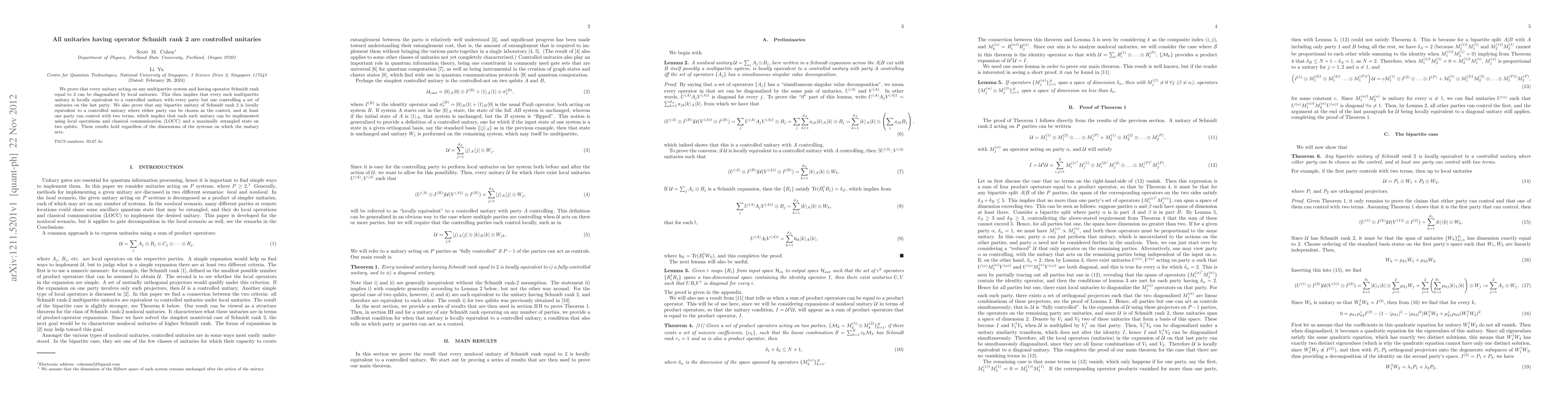 This paper demonstrates that any unitary operator with an operator Schmidt rank of 2 is locally equivalent to a controlled unitary, implying that such unitaries can be implemented using local operations and classical communication (LOCC) and a maximally entangled state on two qubits. The findings apply to both multipartite and bipartite systems.