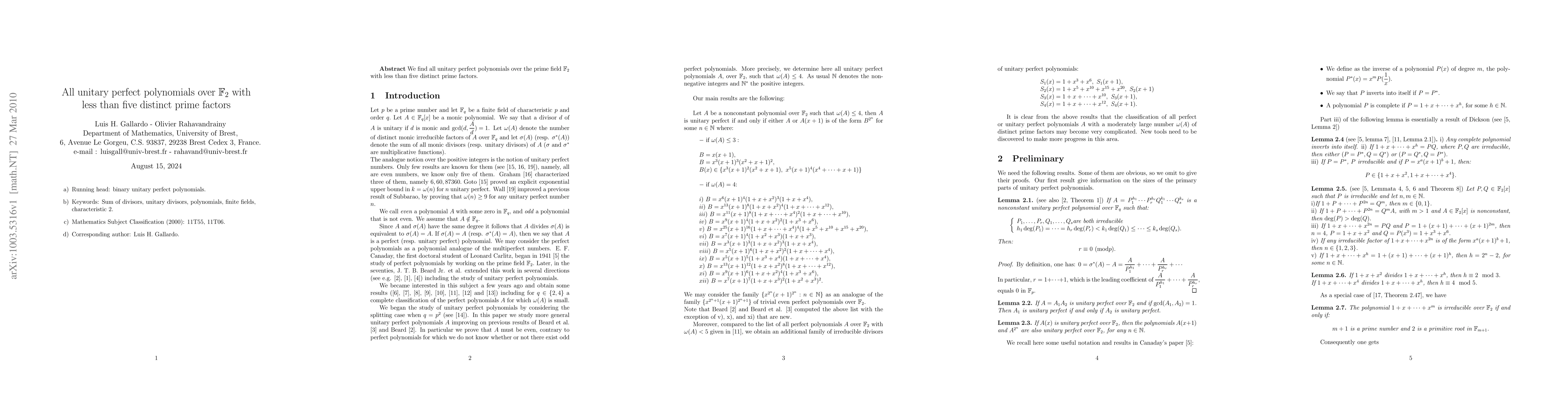 Summary: This paper identifies all unitary perfect polynomials over the finite field $\F_2$ that have fewer than five distinct prime factors. The study provides a complete classification of such polynomials.