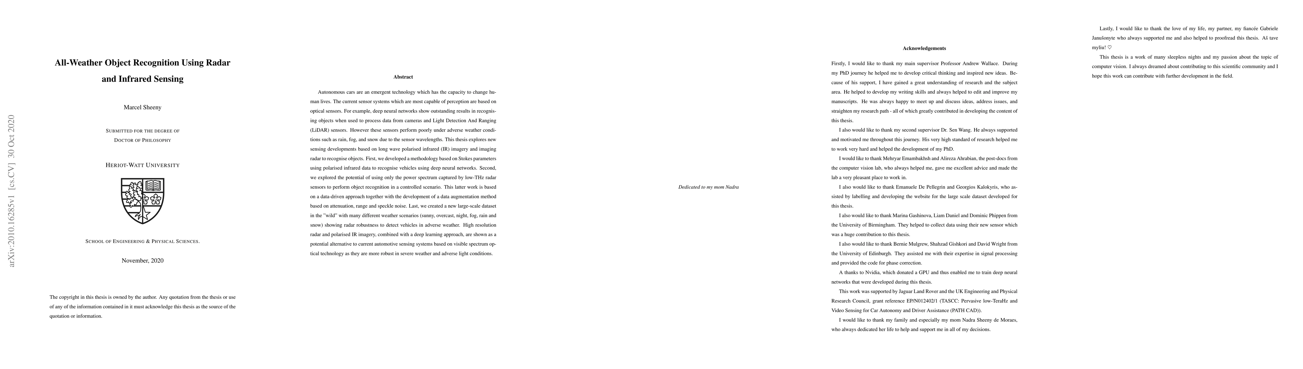 This paper investigates the use of long wave polarised infrared imagery and imaging radar for all-weather object recognition in autonomous vehicles, demonstrating robust performance in adverse weather conditions. It combines deep learning with radar power spectrum and polarised IR data, and presents a new large-scale dataset showcasing radar's effectiveness in various weather scenarios.
