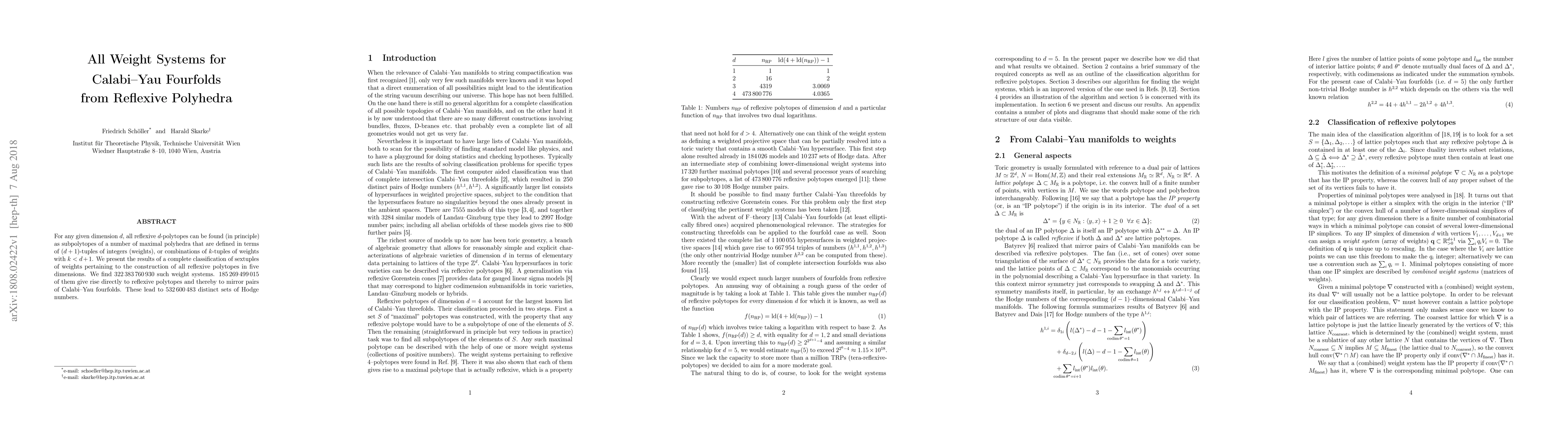 This paper classifies all sextuples of weights that construct reflexive polytopes in five dimensions, identifying 322,383,760,930 weight systems. Of these, 185,269,499,015 lead to mirror pairs of Calabi-Yau fourfolds, resulting in 532,600,483 distinct sets of Hodge numbers.