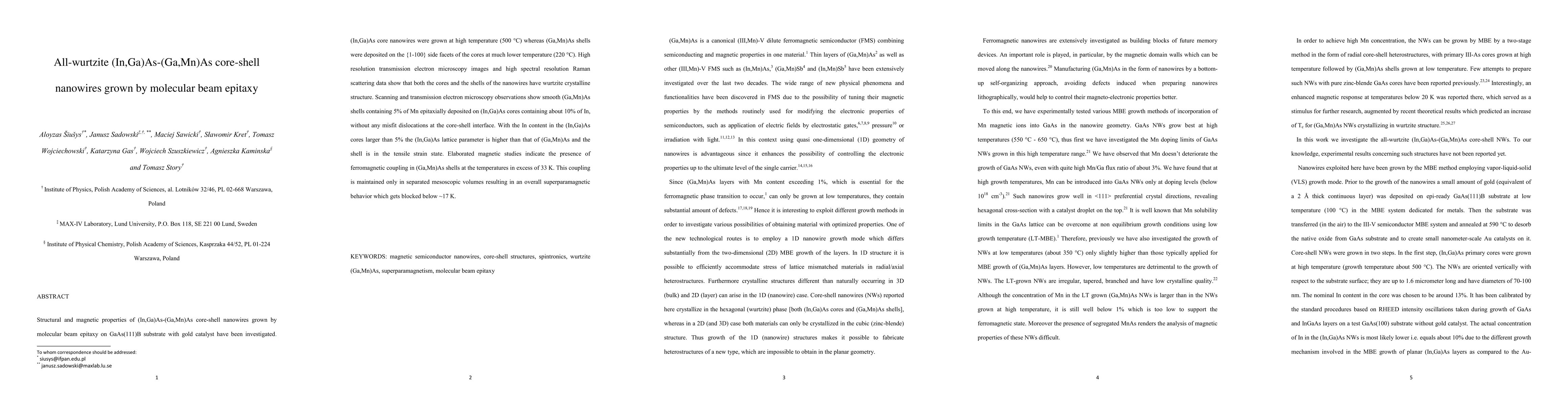 Structural and magnetic properties of (In,Ga)As-(Ga,Mn)As core-shell nanowires grown by molecular beam epitaxy on GaAs(111)B substrate with gold catalyst have been investigated.(In,Ga)As core nanowires were grown at high temperature (500 {\deg}C) whereas (Ga,Mn)As shells were deposited on the {1-100} side facets of the cores at much lower temperature (220 {\deg}C). High resolution transmission electron microscopy images and high spectral resolution Raman scattering data show that both the cores and the shells of the nanowires have wurtzite crystalline structure. Scanning and transmission electron microscopy observations show smooth (Ga,Mn)As shells containing 5% of Mn epitaxially deposited on (In,Ga)As cores containing about 10% of In, without any misfit dislocations at the core-shell interface. With the In content in the (In,Ga)As cores larger than 5% the (In,Ga)As lattice parameter is higher than that of (Ga,Mn)As and the shell is in the tensile strain state. Elaborated magnetic studies indicate the presence of ferromagnetic coupling in (Ga,Mn)As shells at the temperatures in excess of 33 K. This coupling is maintained only in separated mesoscopic volumes resulting in an overall superparamagnetic behavior which gets blocked below ~17 K.