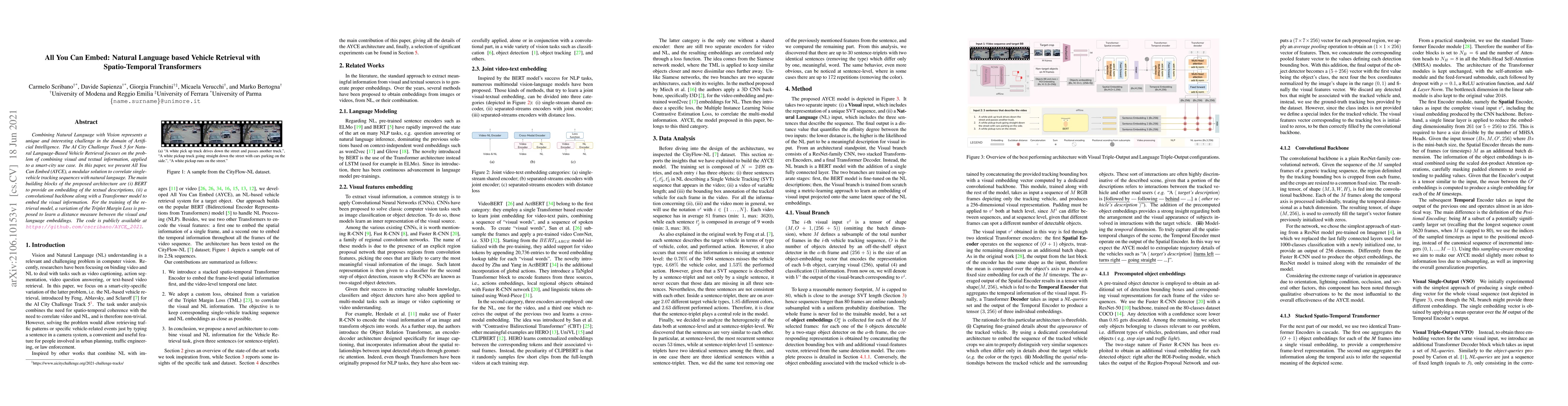 This paper introduces All You Can Embed (AYCE), a system for correlating vehicle tracking sequences with natural language descriptions using BERT and a Transformer model. It employs a Triplet Margin Loss for training to bridge visual and textual embeddings, aiming to enhance vehicle retrieval in smart-city applications. The code is available for public use.