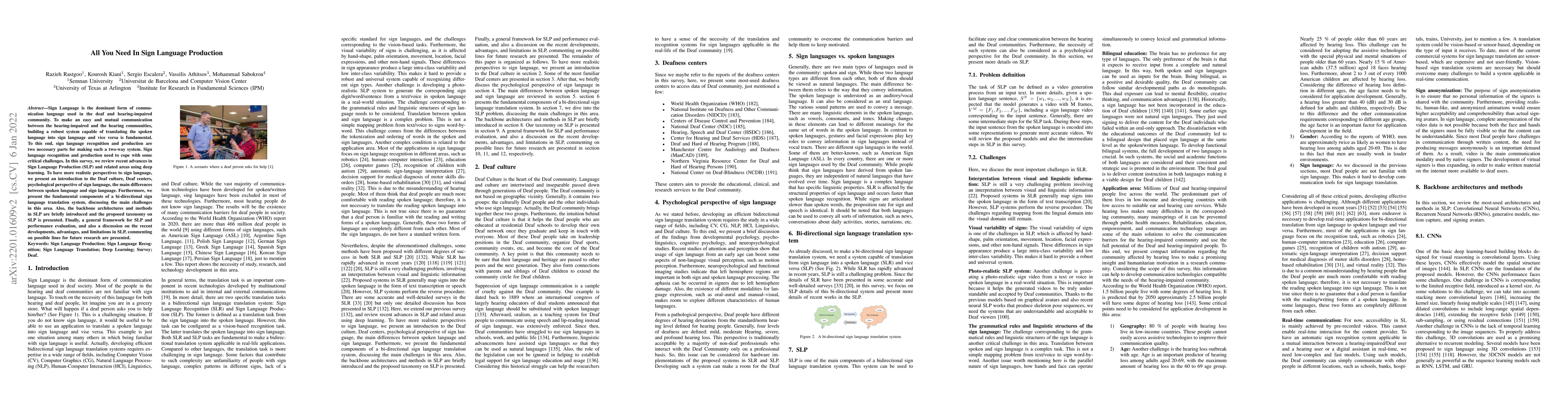Sign Language is the dominant form of communication language used in the deaf and hearing-impaired community. To make an easy and mutual communication between the hearing-impaired and the hearing communities, building a robust system capable of translating the spoken language into sign language and vice versa is fundamental. To this end, sign language recognition and production are two necessary parts for making such a two-way system. Sign language recognition and production need to cope with some critical challenges. In this survey, we review recent advances in Sign Language Production (SLP) and related areas using deep learning. To have more realistic perspectives to sign language, we present an introduction to the Deaf culture, Deaf centers, psychological perspective of sign language, the main differences between spoken language and sign language. Furthermore, we present the fundamental components of a bi-directional sign language translation system, discussing the main challenges in this area. Also, the backbone architectures and methods in SLP are briefly introduced and the proposed taxonomy on SLP is presented. Finally, a general framework for SLP and performance evaluation, and also a discussion on the recent developments, advantages, and limitations in SLP, commenting on possible lines for future research are presented.