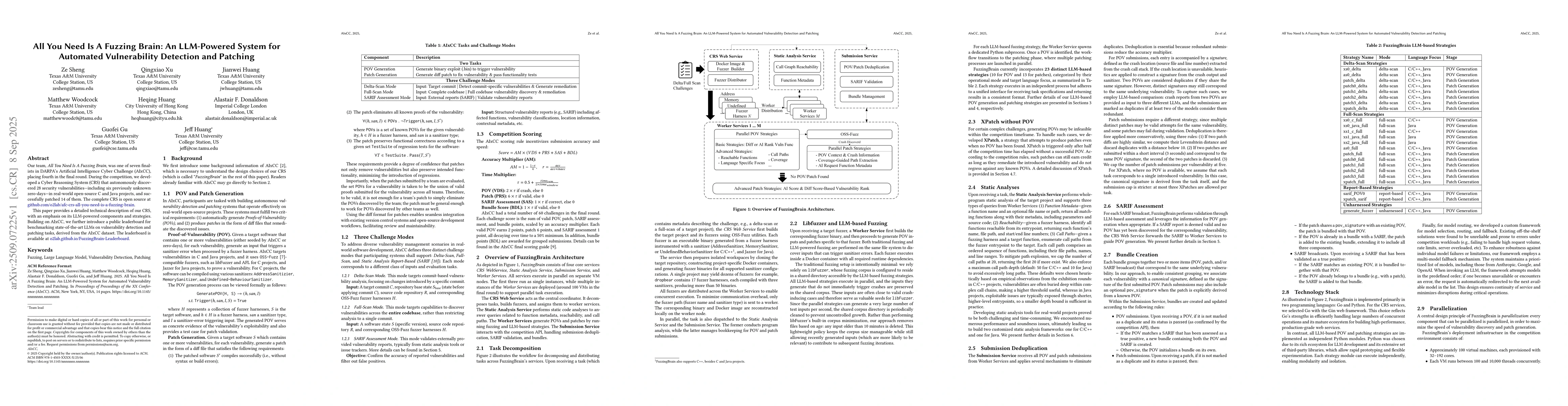 Our team, All You Need Is A Fuzzing Brain, was one of seven finalists in DARPA's Artificial Intelligence Cyber Challenge (AIxCC), placing fourth in the final round. During the competition, we developed a Cyber Reasoning System (CRS) that autonomously discovered 28 security vulnerabilities - including six previously unknown zero-days - in real-world open-source C and Java projects, and successfully patched 14 of them. The complete CRS is open source at https://github.com/o2lab/afc-crs-all-you-need-is-a-fuzzing-brain. This paper provides a detailed technical description of our CRS, with an emphasis on its LLM-powered components and strategies. Building on AIxCC, we further introduce a public leaderboard for benchmarking state-of-the-art LLMs on vulnerability detection and patching tasks, derived from the AIxCC dataset. The leaderboard is available at https://o2lab.github.io/FuzzingBrain-Leaderboard/.