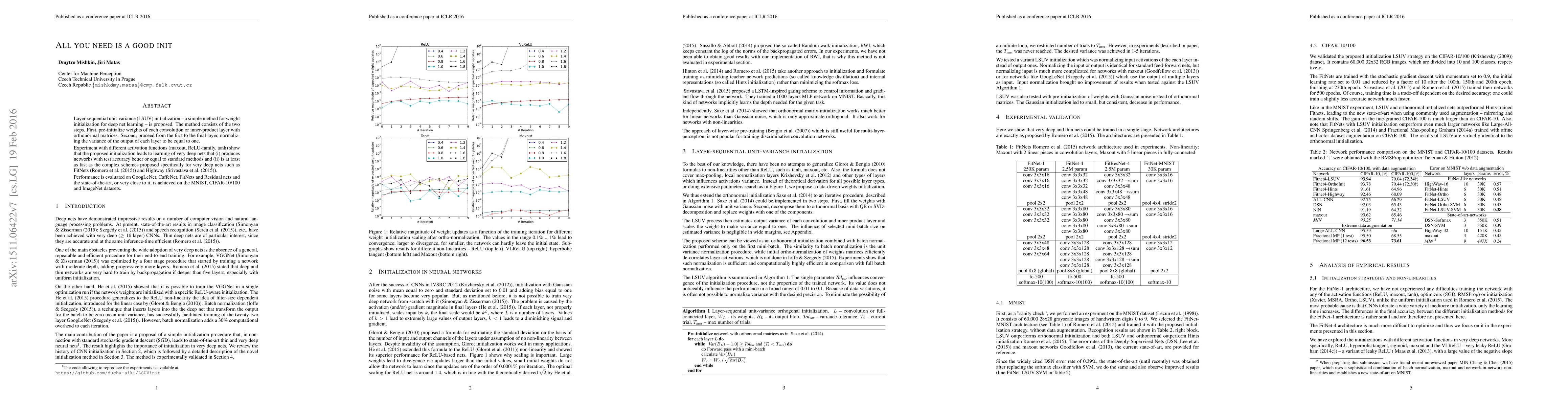A simple weight initialization method called LSUV (Layer-sequential unit-variance) is proposed for deep learning, achieving state-of-the-art performance on various datasets without requiring complex schemes or large computational resources.