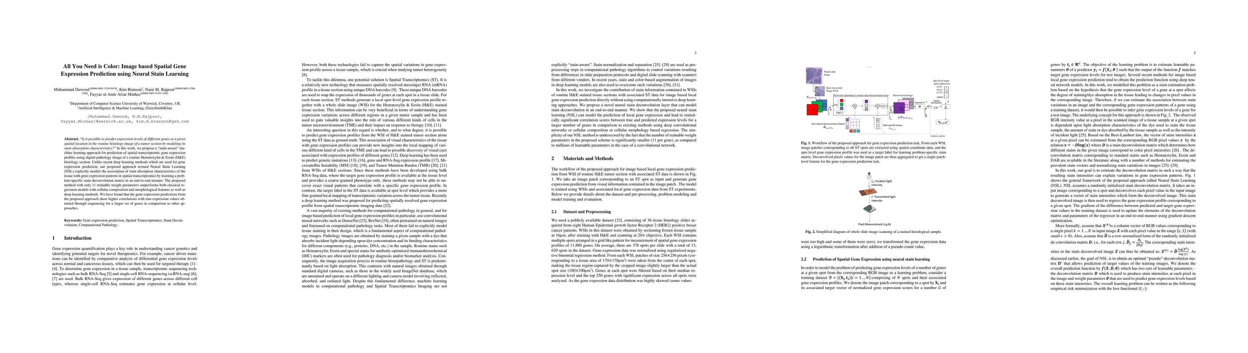 This paper proposes Neural Stain Learning (NSL) to predict gene expression levels in spatial transcriptomics using routine H&E histology images. NSL explicitly models the relationship between stain absorption and gene expression, achieving superior performance with fewer parameters compared to classical and deep learning methods.