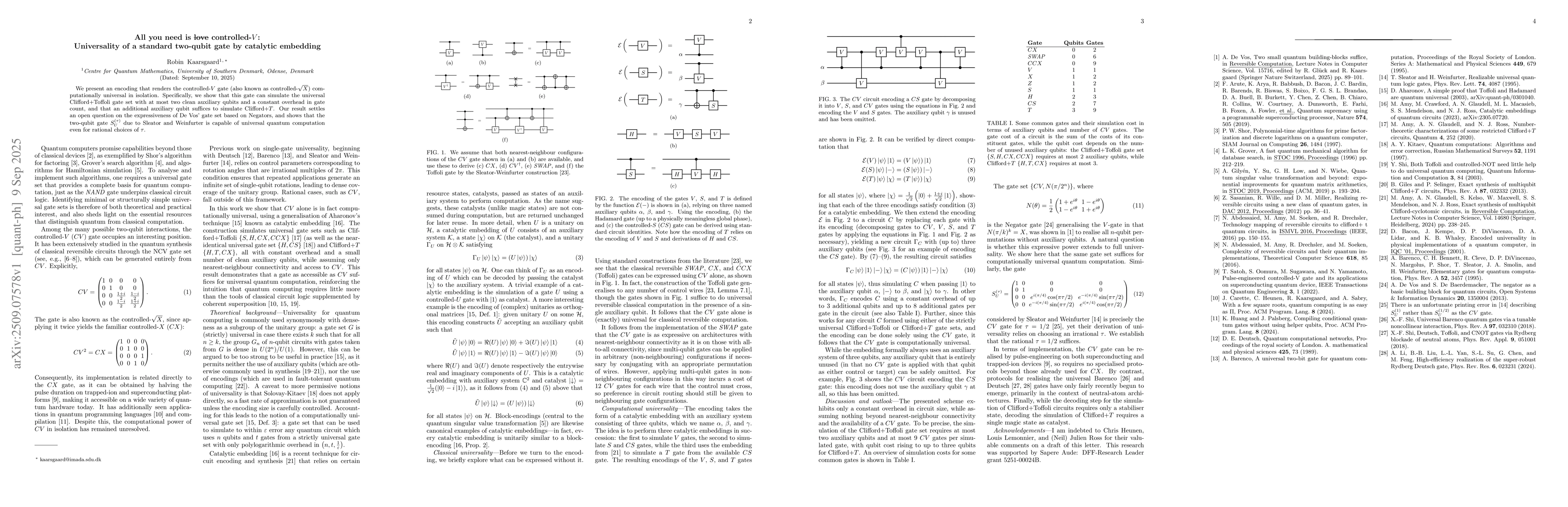 We present an encoding that renders the controlled-V gate (also known as controlled-$\sqrt{X}$) computationally universal in isolation. Specifically, we show that this gate can simulate the universal Clifford+Toffoli gate set with at most two clean auxiliary qubits and a constant overhead in gate count, and that an additional auxiliary qubit suffices to simulate Clifford+T. Our result settles an open question on the expressiveness of De Vos' gate set based on Negators, and shows that the two-qubit gate $SU^{(\tau)}$ due to Sleator and Weinfurter is capable of universal quantum computation even for rational choices of $\tau$.