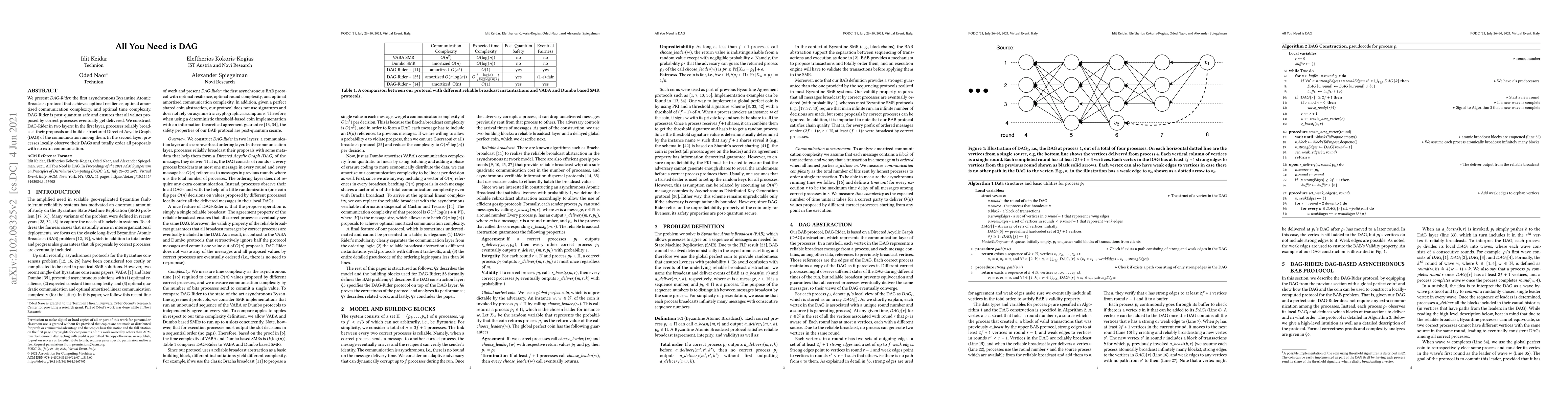 Researchers developed DAG-Rider, a post-quantum safe protocol that enables asynchronous Byzantine Atomic Broadcast with optimal resilience, communication complexity, and time complexity.