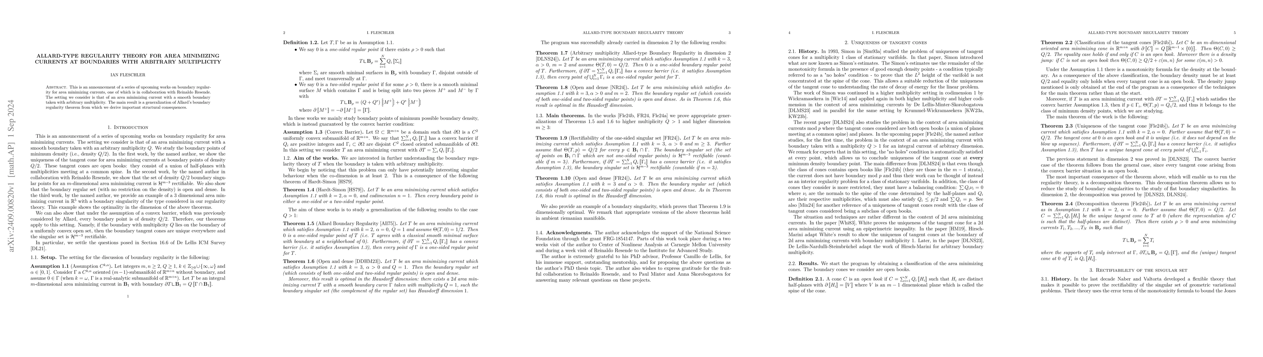 Summary: This paper announces forthcoming works on boundary regularity for area minimizing currents, focusing on smooth boundaries with arbitrary multiplicity. The key result generalizes Allard's boundary regularity theorem, providing significant structural insights.