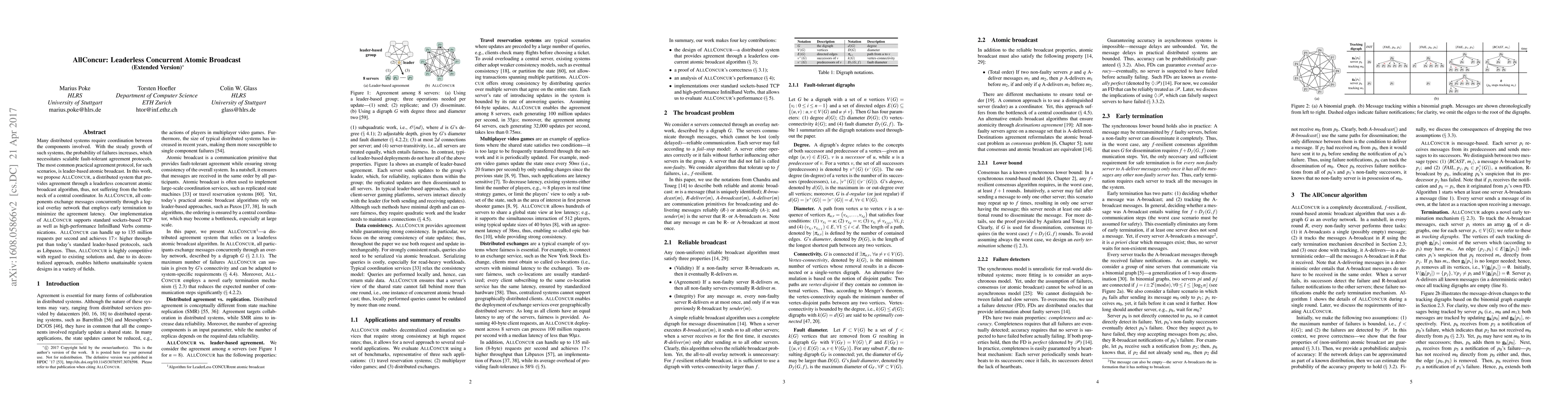 AllConcur proposes a leaderless concurrent atomic broadcast algorithm for distributed systems to achieve scalable fault-tolerant agreement without a central coordinator, supporting high-throughput communication and outperforming existing leader-based protocols by 17x.
