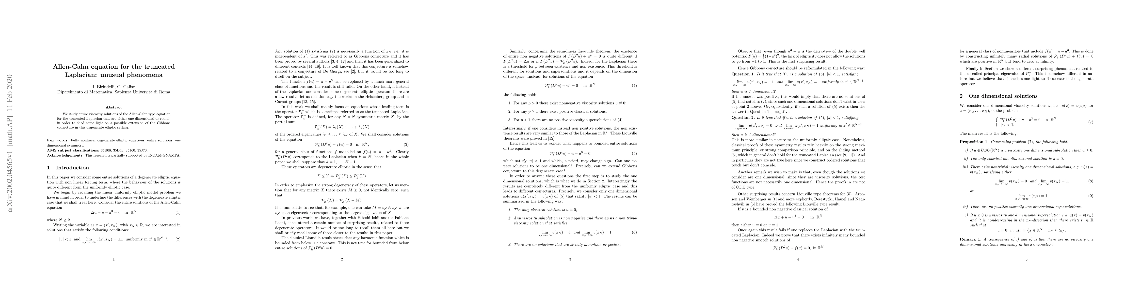 We study entire viscosity solutions of the Allen-Cahn type equation for the truncated Laplacian that are either one dimensional or radial, in order to shed some light on a possible extension of the Gibbons conjecture in this degenerate elliptic setting.