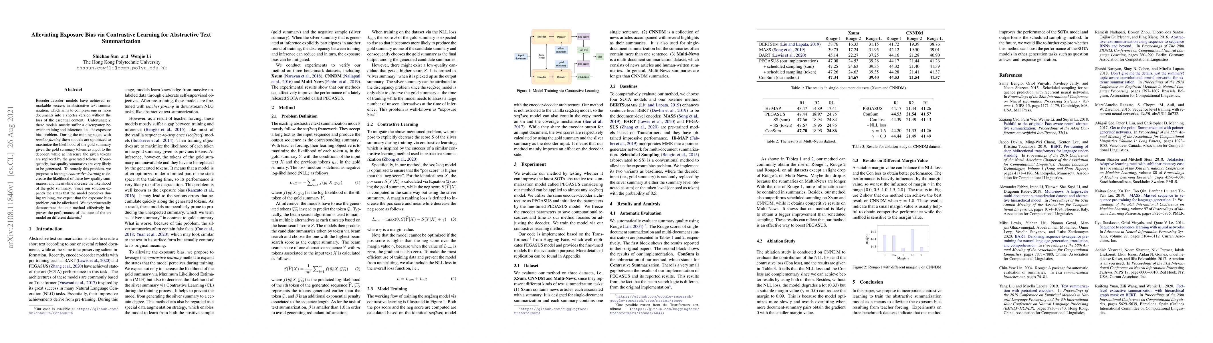 This paper proposes using contrastive learning to mitigate the exposure bias problem in abstractive text summarization models, which suffer from a discrepancy between training and inference. The method enhances the model's ability to generate high-quality summaries, as demonstrated by improved performance on various datasets.