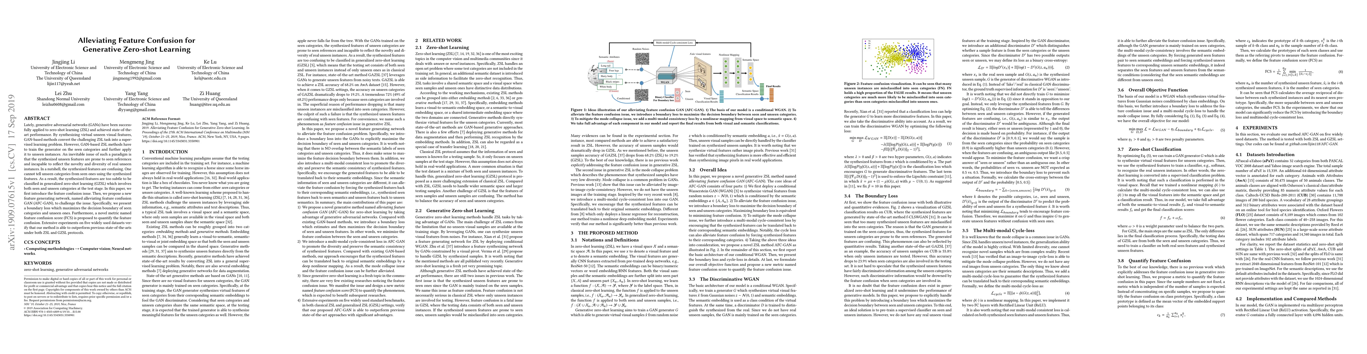 Lately, generative adversarial networks (GANs) have been successfully applied to zero-shot learning (ZSL) and achieved state-of-the-art performance. By synthesizing virtual unseen visual features, GAN-based methods convert the challenging ZSL task into a supervised learning problem. However, GAN-based ZSL methods have to train the generator on the seen categories and further apply it to unseen instances. An inevitable issue of such a paradigm is that the synthesized unseen features are prone to seen references and incapable to reflect the novelty and diversity of real unseen instances. In a nutshell, the synthesized features are confusing. One cannot tell unseen categories from seen ones using the synthesized features. As a result, the synthesized features are too subtle to be classified in generalized zero-shot learning (GZSL) which involves both seen and unseen categories at the test stage. In this paper, we first introduce the feature confusion issue. Then, we propose a new feature generating network, named alleviating feature confusion GAN (AFC-GAN), to challenge the issue. Specifically, we present a boundary loss which maximizes the decision boundary of seen categories and unseen ones. Furthermore, a novel metric named feature confusion score (FCS) is proposed to quantify the feature confusion. Extensive experiments on five widely used datasets verify that our method is able to outperform previous state-of-the-arts under both ZSL and GZSL protocols.
