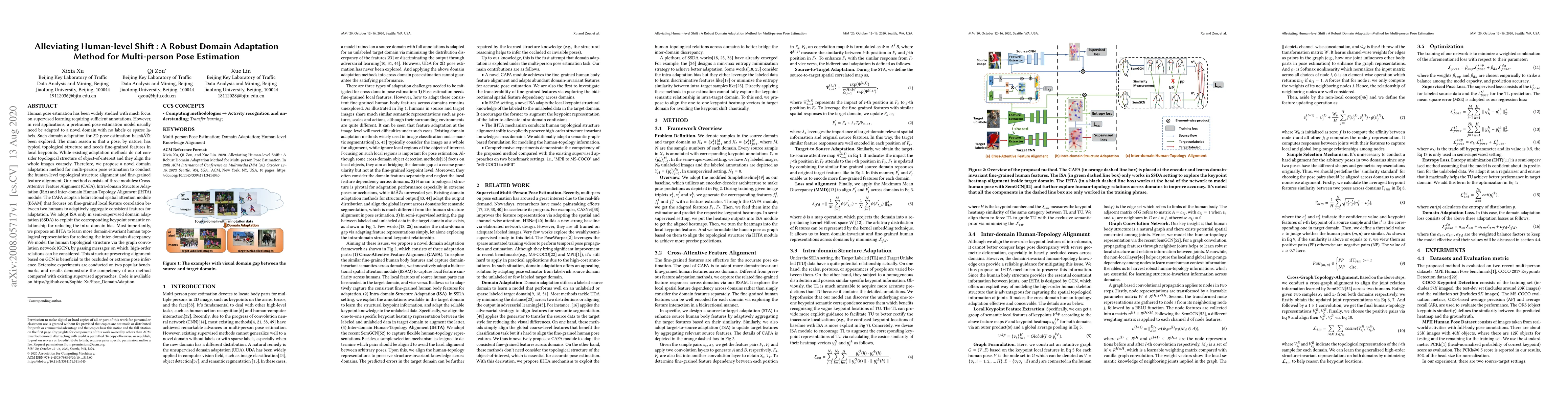This paper proposes a novel domain adaptation method for multi-person pose estimation that addresses the challenge of adapting pretrained models to novel domains with limited or no labels. The method includes three modules: Cross-Attentive Feature Alignment, Intra-domain Structure Adaptation, and Inter-domain Human-Topology Alignment, which focus on fine-grained feature and topological structure alignment to improve pose estimation in new domains.