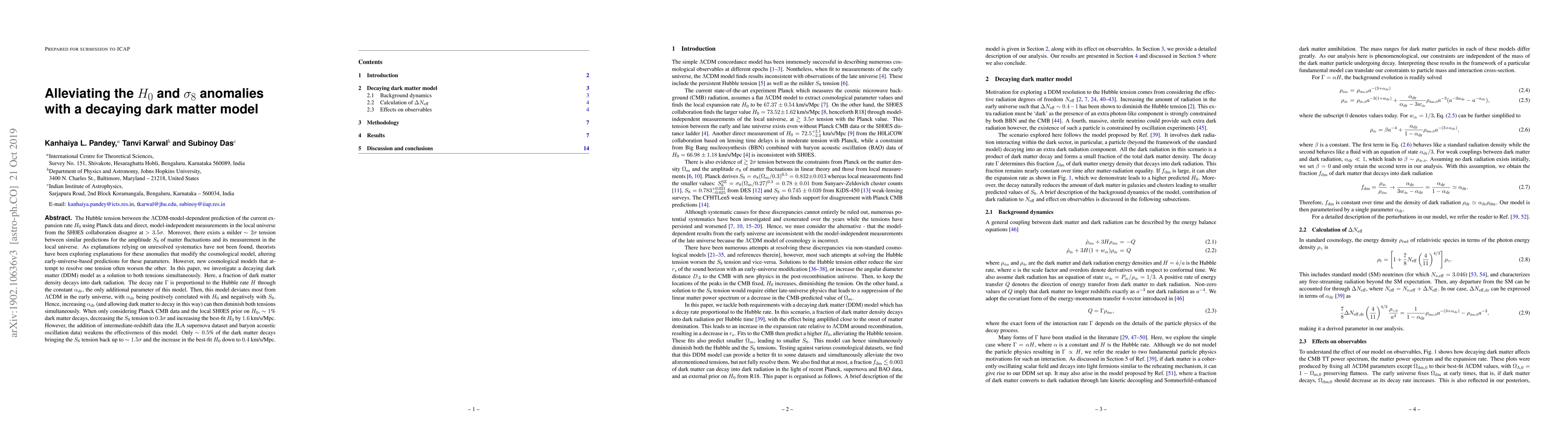 The Hubble tension between the $\Lambda$CDM-model-dependent prediction of the current expansion rate $H_0$ using Planck data and direct, model-independent measurements in the local universe from the SH0ES collaboration disagree at $>3.5\sigma$. Moreover, there exists a milder $\sim 2\sigma$ tension between similar predictions for the amplitude $S_8$ of matter fluctuations and its measurement in the local universe. As explanations relying on unresolved systematics have not been found, theorists have been exploring explanations for these anomalies that modify the cosmological model, altering early-universe-based predictions for these parameters. However, new cosmological models that attempt to resolve one tension often worsen the other. In this paper, we investigate a decaying dark matter (DDM) model as a solution to both tensions simultaneously. Here, a fraction of dark matter density decays into dark radiation. The decay rate $\Gamma$ is proportional to the Hubble rate $H$ through the constant $\alpha_{\rm dr}$, the only additional parameter of this model. Then, this model deviates most from $\Lambda$CDM in the early universe, with $\alpha_{\rm dr}$ being positively correlated with $H_0$ and negatively with $S_8$. Hence, increasing $\alpha_{\rm dr}$ (and allowing dark matter to decay in this way) can then diminish both tensions simultaneously. When only considering Planck CMB data and the local SH0ES prior on $H_0$, $\sim 1$\% dark matter decays, decreasing the $S_8$ tension to $0.3\sigma$ and increasing the best-fit $H_0$ by $1.6$ km/s/Mpc. However, the addition of intermediate-redshift data (the JLA supernova dataset and baryon acoustic oscillation data) weakens the effectiveness of this model. Only $\sim 0.5$\% of the dark matter decays bringing the $S_8$ tension back up to $\sim 1.5 \sigma$ and the increase in the best-fit $H_0$ down to $0.4$ km/s/Mpc.