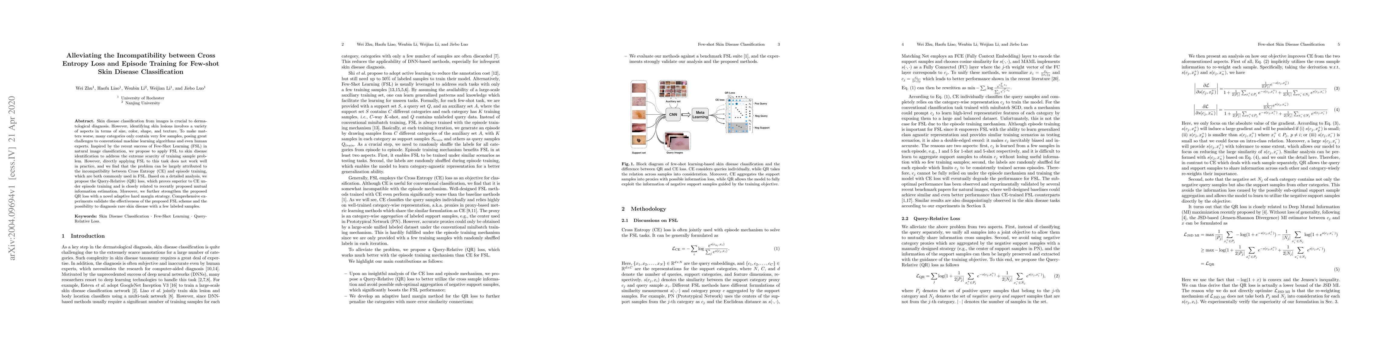 Skin disease classification from images is crucial to dermatological diagnosis. However, identifying skin lesions involves a variety of aspects in terms of size, color, shape, and texture. To make matters worse, many categories only contain very few samples, posing great challenges to conventional machine learning algorithms and even human experts. Inspired by the recent success of Few-Shot Learning (FSL) in natural image classification, we propose to apply FSL to skin disease identification to address the extreme scarcity of training sample problem. However, directly applying FSL to this task does not work well in practice, and we find that the problem can be largely attributed to the incompatibility between Cross Entropy (CE) and episode training, which are both commonly used in FSL. Based on a detailed analysis, we propose the Query-Relative (QR) loss, which proves superior to CE under episode training and is closely related to recently proposed mutual information estimation. Moreover, we further strengthen the proposed QR loss with a novel adaptive hard margin strategy. Comprehensive experiments validate the effectiveness of the proposed FSL scheme and the possibility to diagnosis rare skin disease with a few labeled samples.